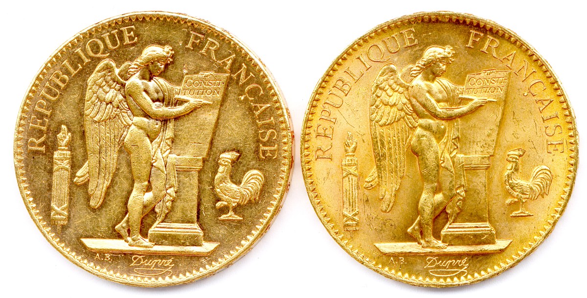 Lot de deux pièces IIIe République: 100 Francs or (L-E-F) 1908 et 1911 Paris. Très beaux.
