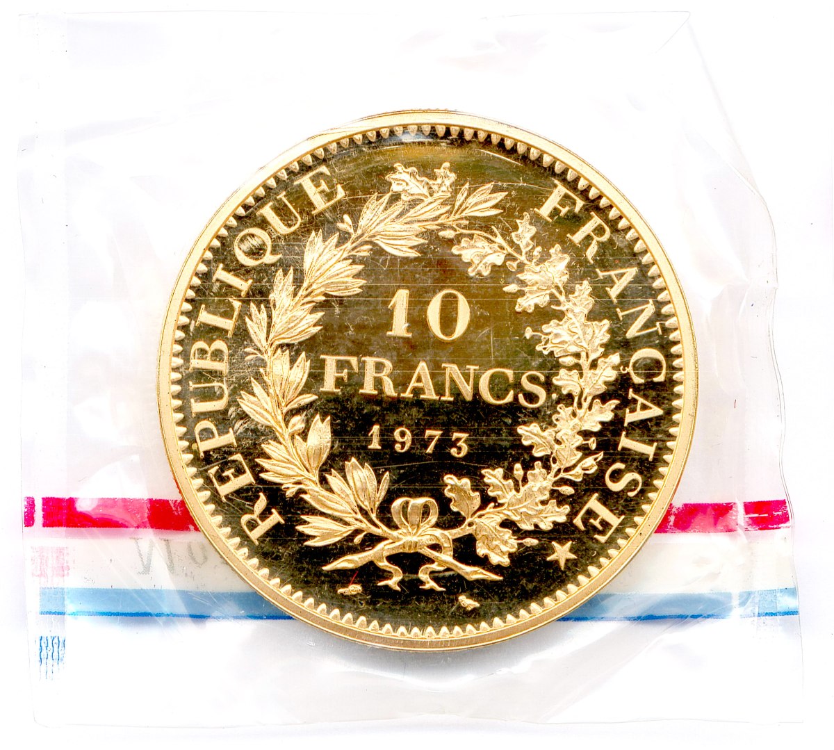 Piéfort en or 10 Francs Hercule 1973 (84,15g) sous sachet scellé de la Monnaie de Paris.FDC