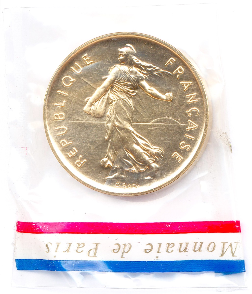 Piéfort en or 5 Francs Semeuse 1973 (38,90g) sous sachet scellé de la Monnaie de Paris.