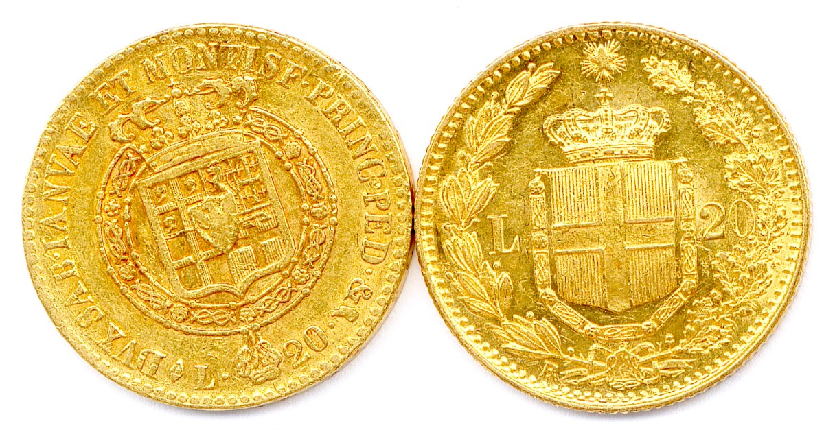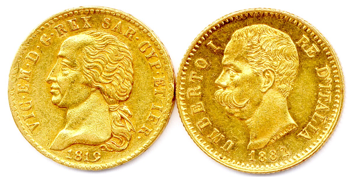 Lot de deux pièces de 20 lire en or: Victor Emmanuel 1819 Turin et Umberto 1882 Rome. T.B. et Superbe.