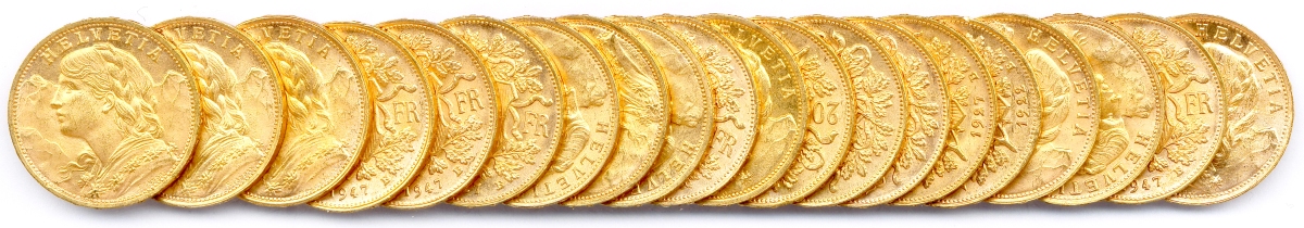 Lot de 20 pièces de 20 Francs or Suisse (type Vreneli). Superbes.