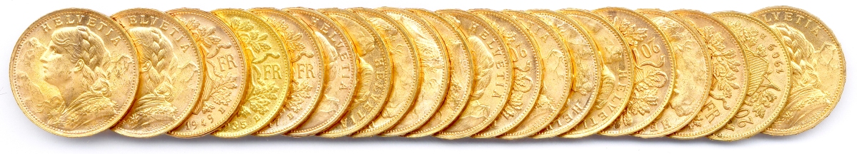 Lot de 20 pièces de 20 Francs or Suisse (type Vreneli). Superbes.