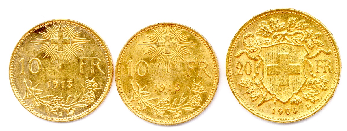 Lot de trois pièces d'or de la Suisse: 20 Francs 1904, 10 Francs 1913 et 1915 Berne.