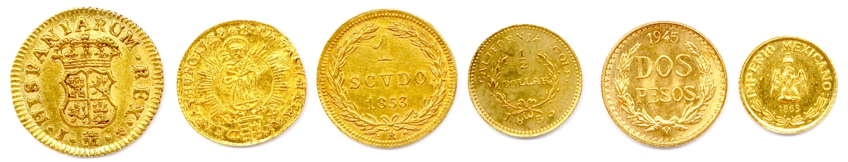 Demi-scudo Ferdinand VI d'Espagne 1759 Madrid, 1/6 ducat à la Madonne Charles III de Hongrie 1728 N-B, Scudo Vatican Pie IX 1853-VIII Rome, 1/2 dollar Californie 1853, Dos pesos Mexique 1945, Miniature 1865 Mexique.