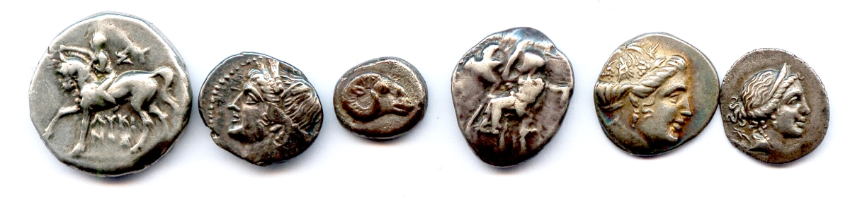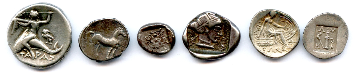 statère de Tarente (Taras), obole de Carthage (cheval), diobole de Méthymna (tête de bélier), hémidrachme Arcadie (Artémis/Zeus Lycaïos), triobole d''Histiée (nymphe sur proue), Quart de drachme de Lycie (carquois et torche).