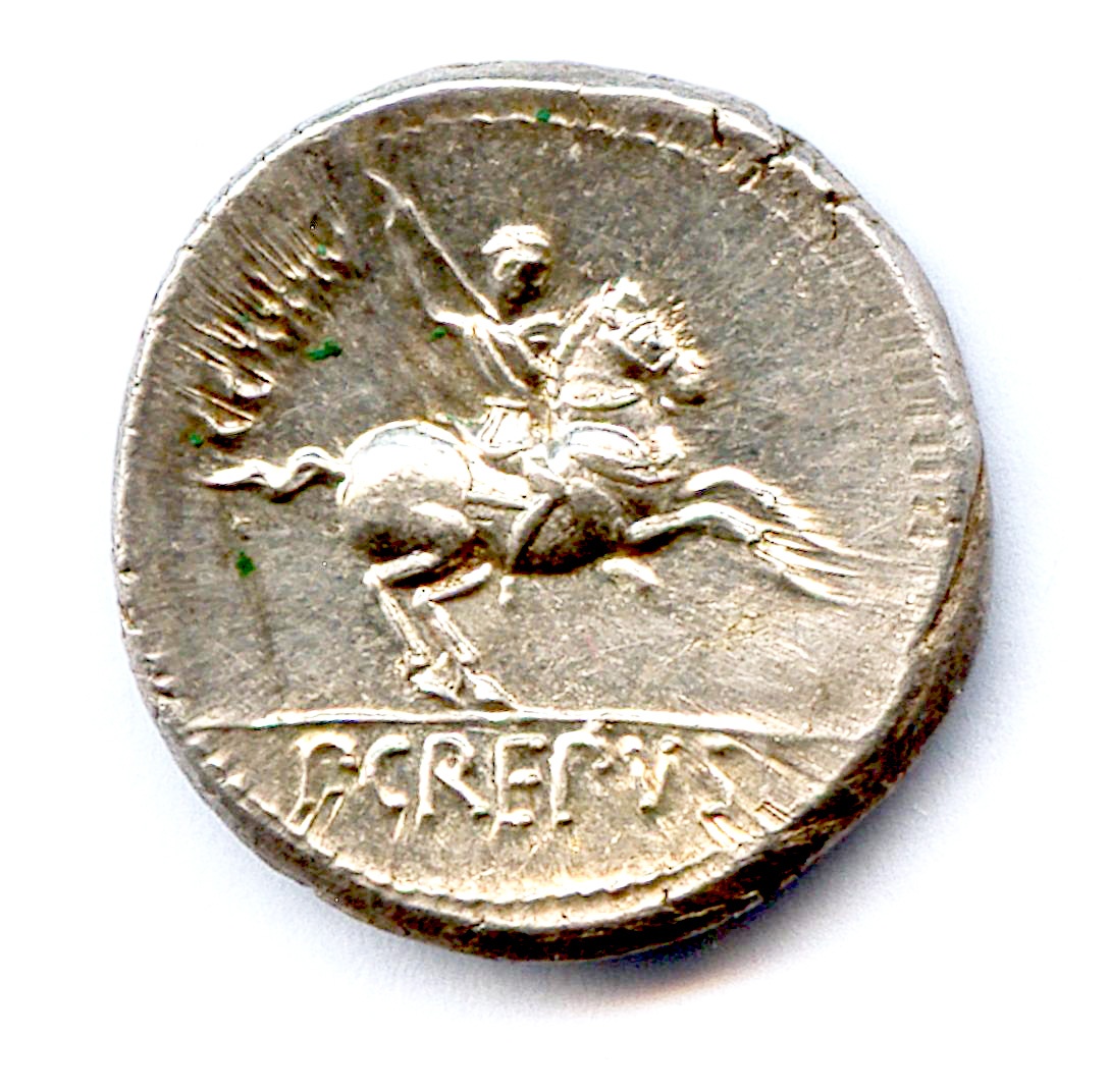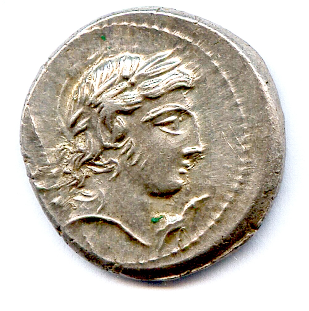 Denier d'argent (tête d'Apollon:cavalier). Crawford 361/1c; Sydenham 738a