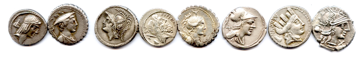Calpurnia (coursier), Mamilia (Ulysse reconnu par son chien Argos), Minucia (Combat), Nonia (Victoire couronne Rome), Plautia (tête tourelée), Pompeia (Romulus et Remus), Postumia (sacrifice), Veturia (tête de Mars).