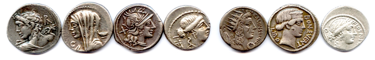 Caesia (Apollon Vejovis/les dieux Lares), Cassia (scène de vote), Coelia (tête du soleil), Junia (tête de Rome), Postumia (caducée), Scribonia (Puits), Serviali (tête de Flore).