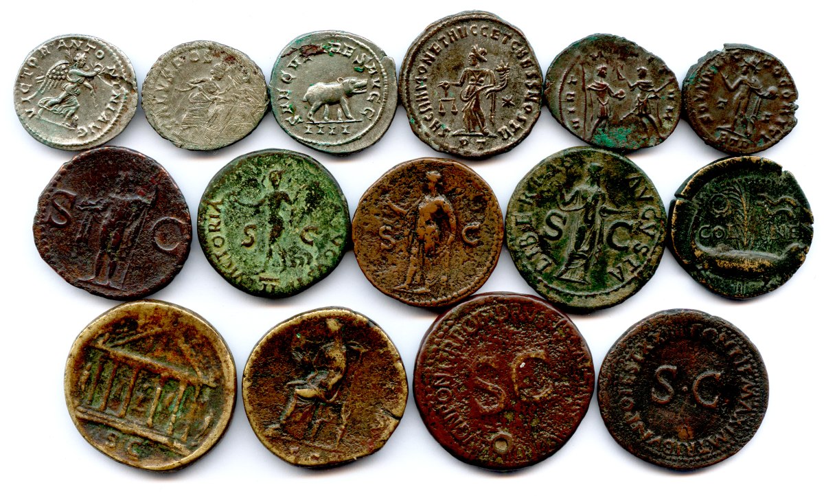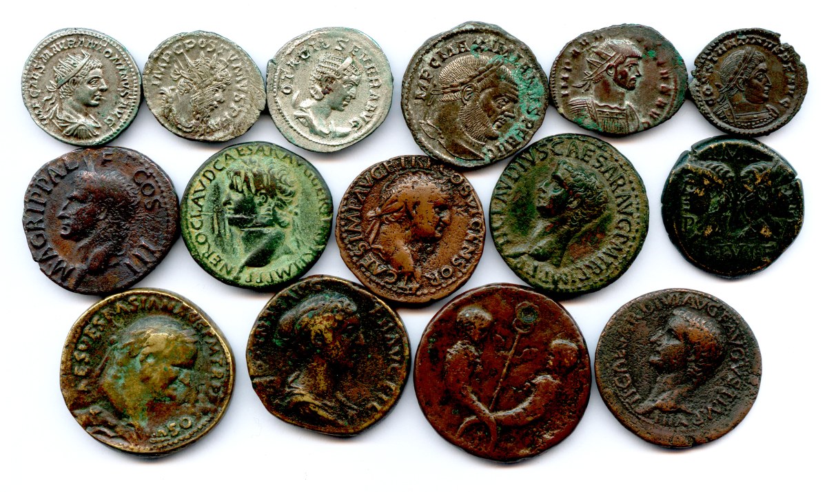 Lot de quatorze monnaies romaines dont trois antoniniens en argent (Caracalla, Postume, Otacilie) et douze bronzes (sesterces, dupondii, as et folles).