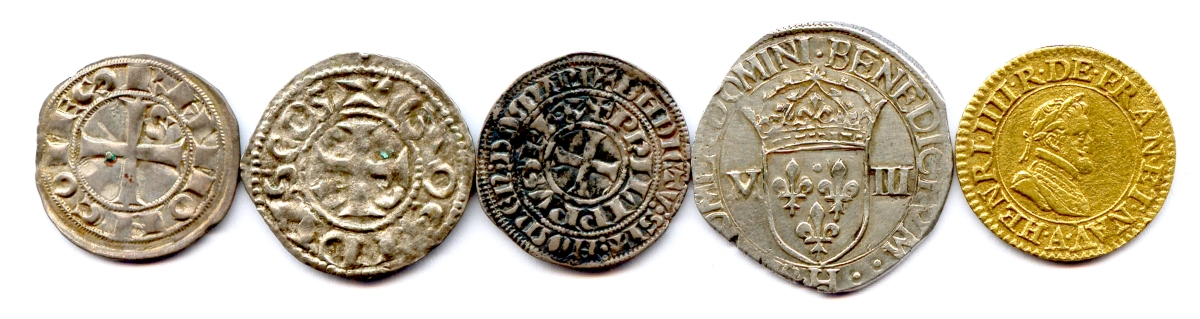 Denier de Raymond VII comte de Toulouse, Denier au monogramme de Foulques pour Geoffroi II (1040-1060) duc d'Anjou, Maille blanche de Philippe IV le Bel (1285-1314), Huitième d'écu d'Henri III (1574-1589), Double tournois (cuivre doré) 1608 d'Henri IV (1589-1610).