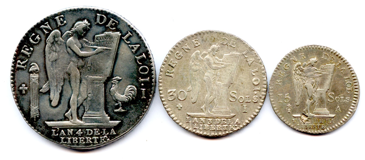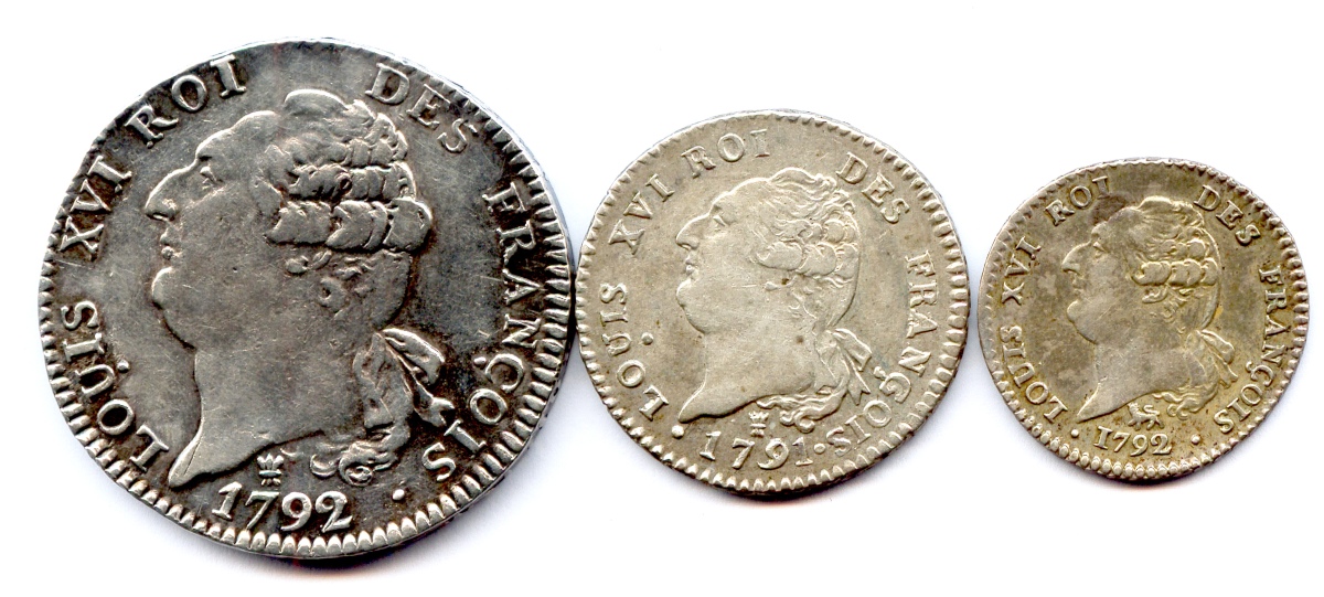 Lot de trois monnaies d'argent du gouvernement constitutionnel de Louis XVI: