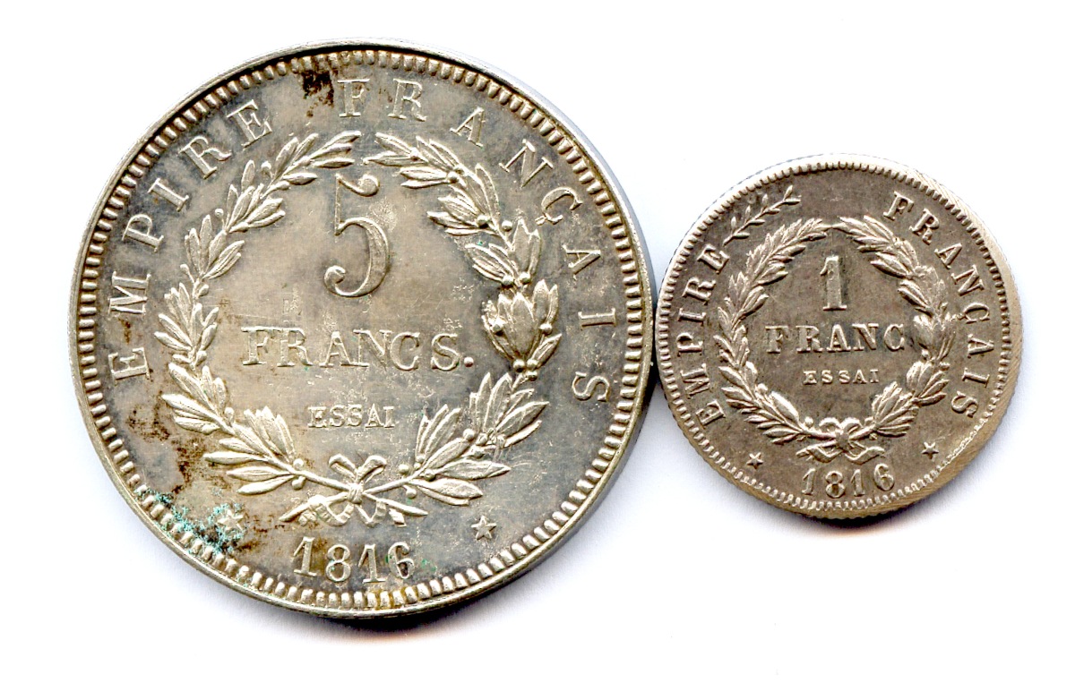 5 francs et Franc 1816. Frappes du souvenir en 1860, sous Napoléon III.