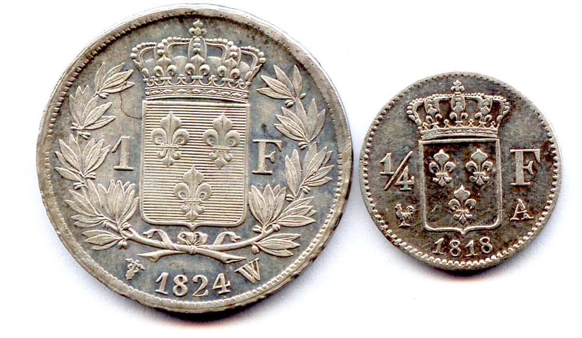 Lot de deux monnaies d'argent Louis XVIII (1815-1824): Franc 1824 Lille et Quart de franc 1818 Paris.
