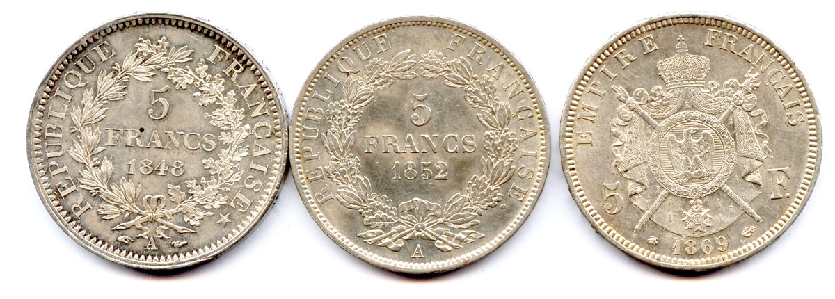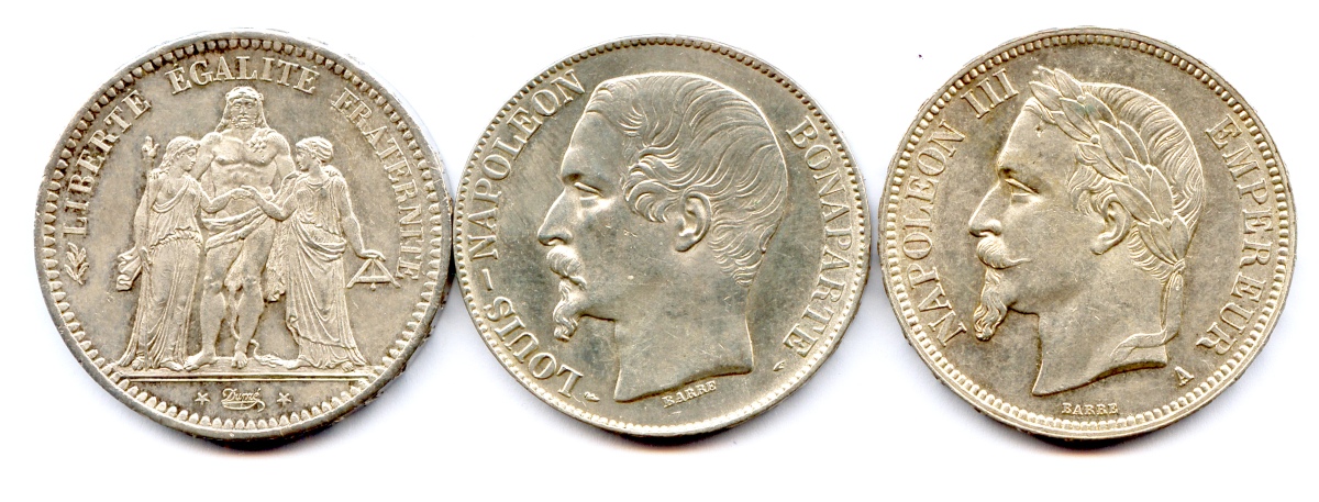 Lot de trois monnaies d'argent: 5 Francs (type Hercule) 1848 Paris, 5 Francs Louis Napoléon 1852 Paris et 5 Francs Napoléon III 1869 Paris. Superbes.