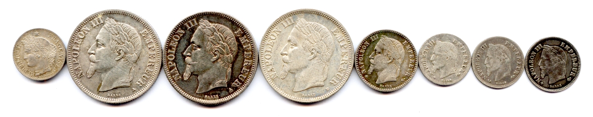 Lot de huit monnaies en argent: 20 cent. République (type Cérès) 1850 Paris; 2 Francs Napoléon III 1866 Paris, 2 Francs 1867 Paris, 2 Francs 1869 Strasbourg, 50 cent. 1866 Strasbourg, 20 cent. 1866 Paris et Strasbourg, 20 cent. 1867 Strasbourg.