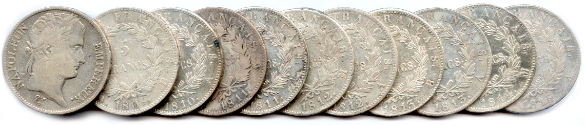 Lot de onze pièces d'argent 5 Francs Napoléon Ier: