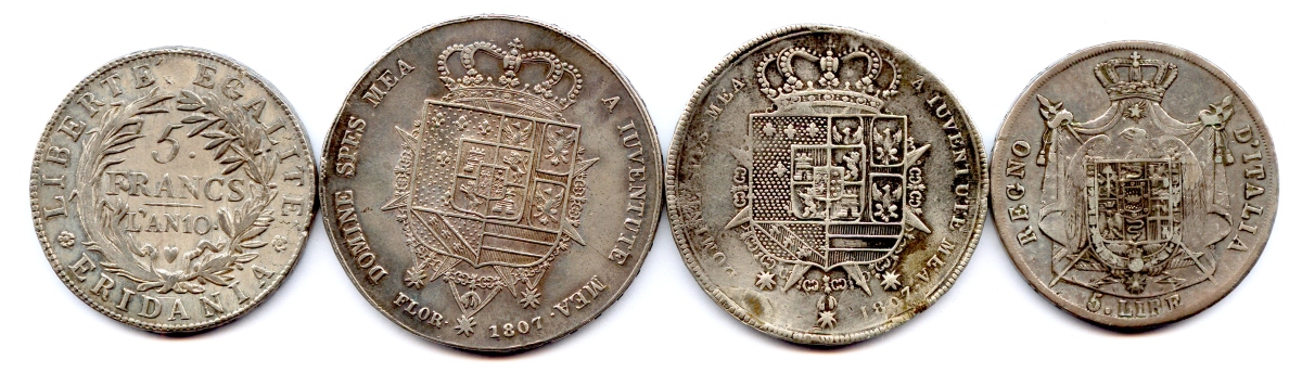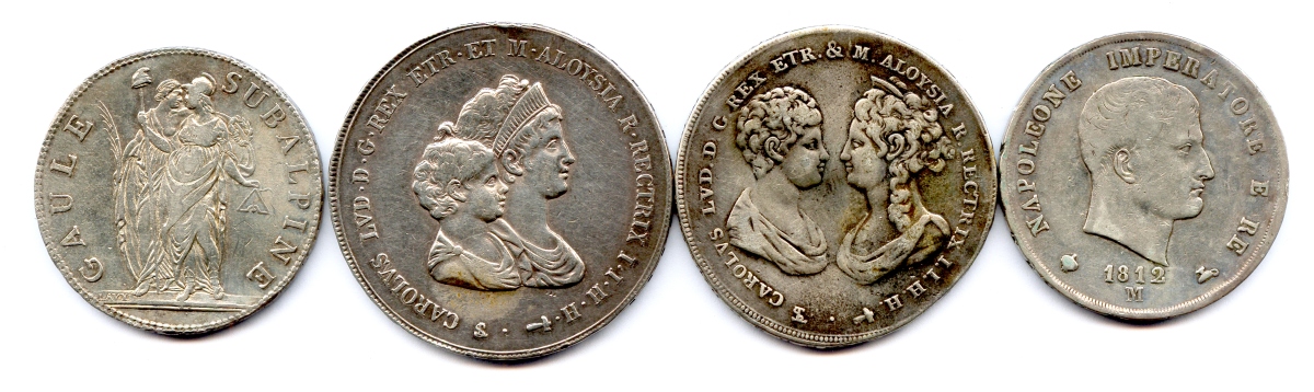 5 Francs Gaule Subalpine an 10, Charles-Louis et Marie-Aloyse d'Etrurie Dena de Florence 1807 et Francescone 1807 (très endommagée), 5 Lire 1812 Milan.