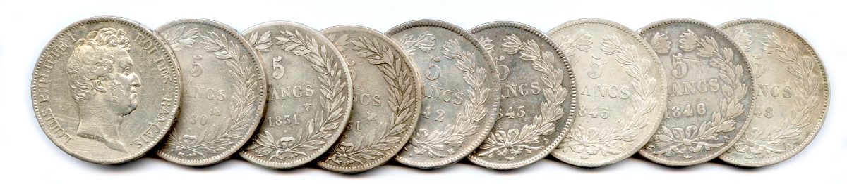 Lot de neuf pièces d'argent Louis Philippe Ier: 5 Francs 1830 Paris et Rouen, 1831 Bordeaux et Lille, 1842 Strasbourg, 1843 Paris, 1845 Paris, 1846 Paris et 1848 Paris. Beaux et T.B.