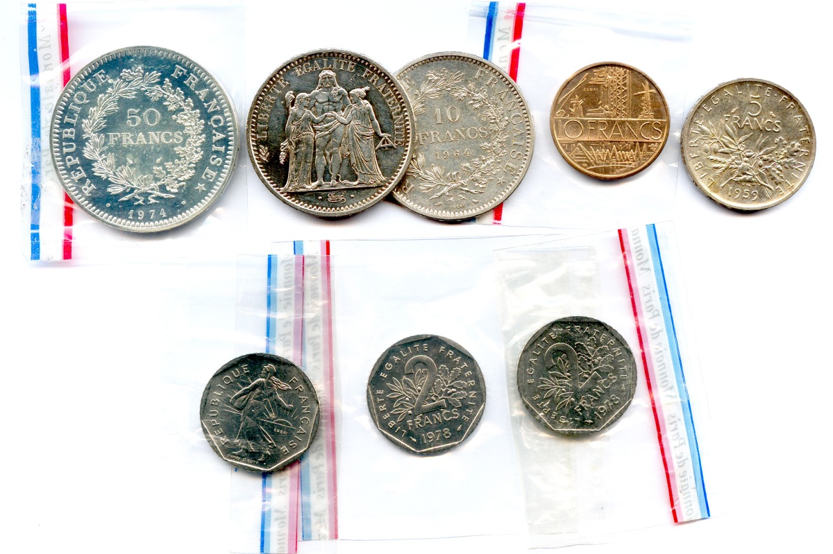 Lot de huit essais: 50 Francs Hercule 1974, 10 Francs Hercule 1964, 10 Francs Mathieu (cupro-nickel) 1974, 5 Francs Semeuse 1959, 2 Francs Semeuse 1978 (3 ex.).