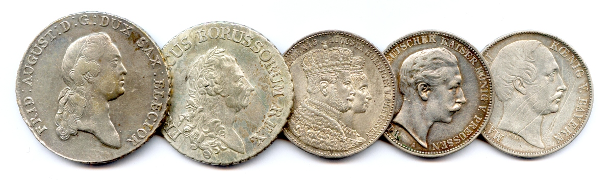 Lot de cinq monnaies allemandes en argent: Thaler 1769 Frédéric Auguste de Saxe (1763-1827), Reichthaler 1784 A Frédéric de Prusse (1740-1786), Vereinstaler 1864 Berlin Guillaume et Augusta de Prusse (1861-1888), Verinstaler 1862 (très endommagé) Maximilien II Bavière (1848-1864), Drei mark 1912 Guillaume II de Prusse (1888-1918).