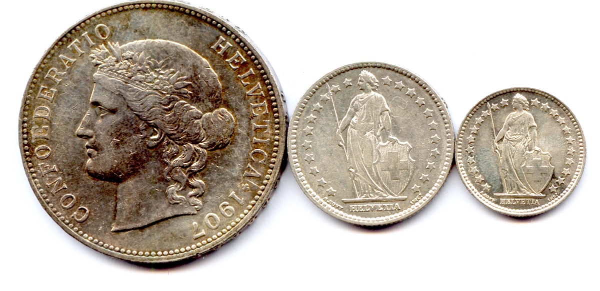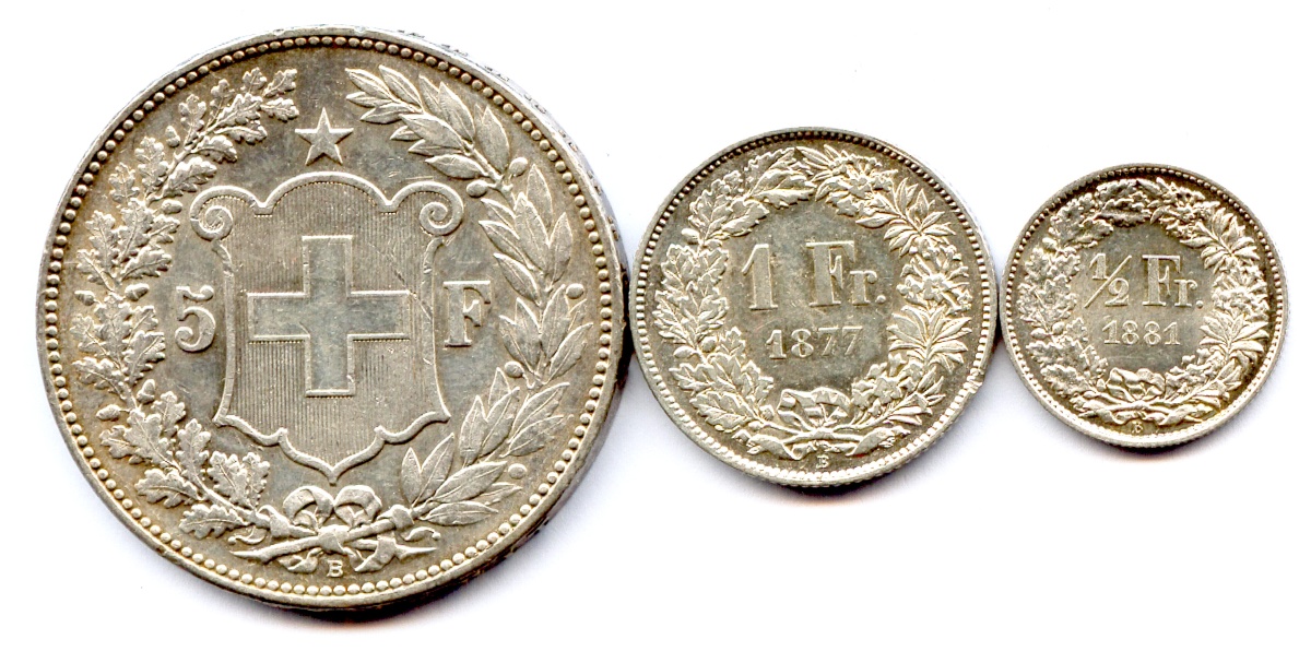 5 Francs 1907 B, Franc 1877 et demi-franc 1881.