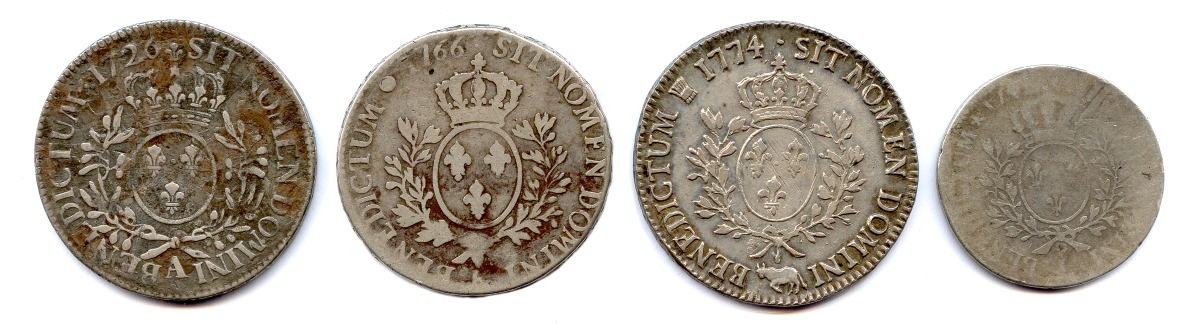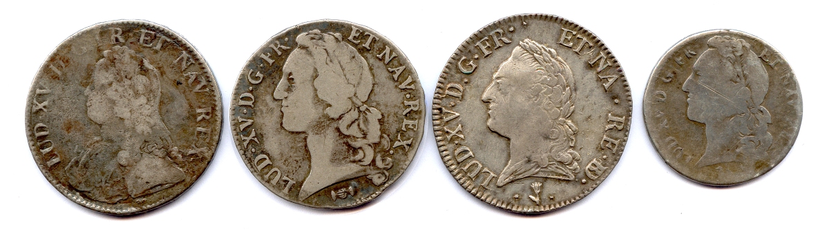 écu aux lunettes 1726 Paris (usé), écu au bandeau 1766 Bordeaux (usé), demi-écu au bandeau 174(-) Bayonne (usé), écu à la Vieille Tête 1774 Pau. B. T.B.