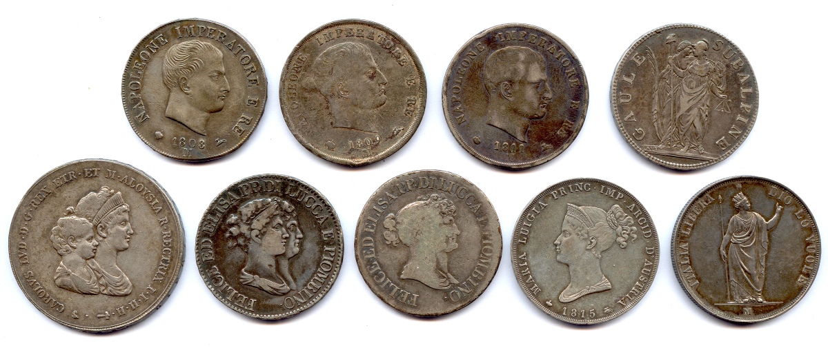 Marie Louise 5 Lire 1815 Milan, Gaule Subalpine 5 Francs an 10 Turin,