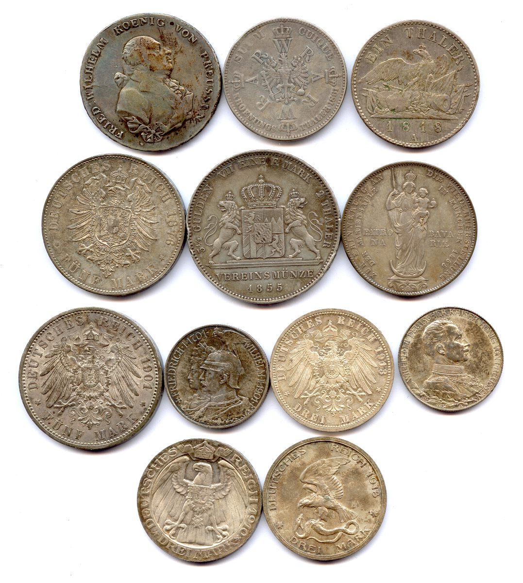 Thaler Frédéric Guillaume de Prusse 1791, demi-thaler Frédéric et Augusta 1861, Thaler Frédéric Guillaume III de Prusse 1818, 5 Mark Frédéric de Bade 1876, double thaler Maximilien II de Bavière 1855, double gulden Maximilien de Bavière 1855, 5 Mark et 2 Mark de Frédéric et Guillaume II du bicentenaire du royaume de Prusse 1901, 3 Mark et 2 Mark de Guillaume II de Prusse 1913, 3 Mark 100e anniversaire de lUniversité de Berlin 1910, 3 Mark Guillaume II de Prusse 1913.