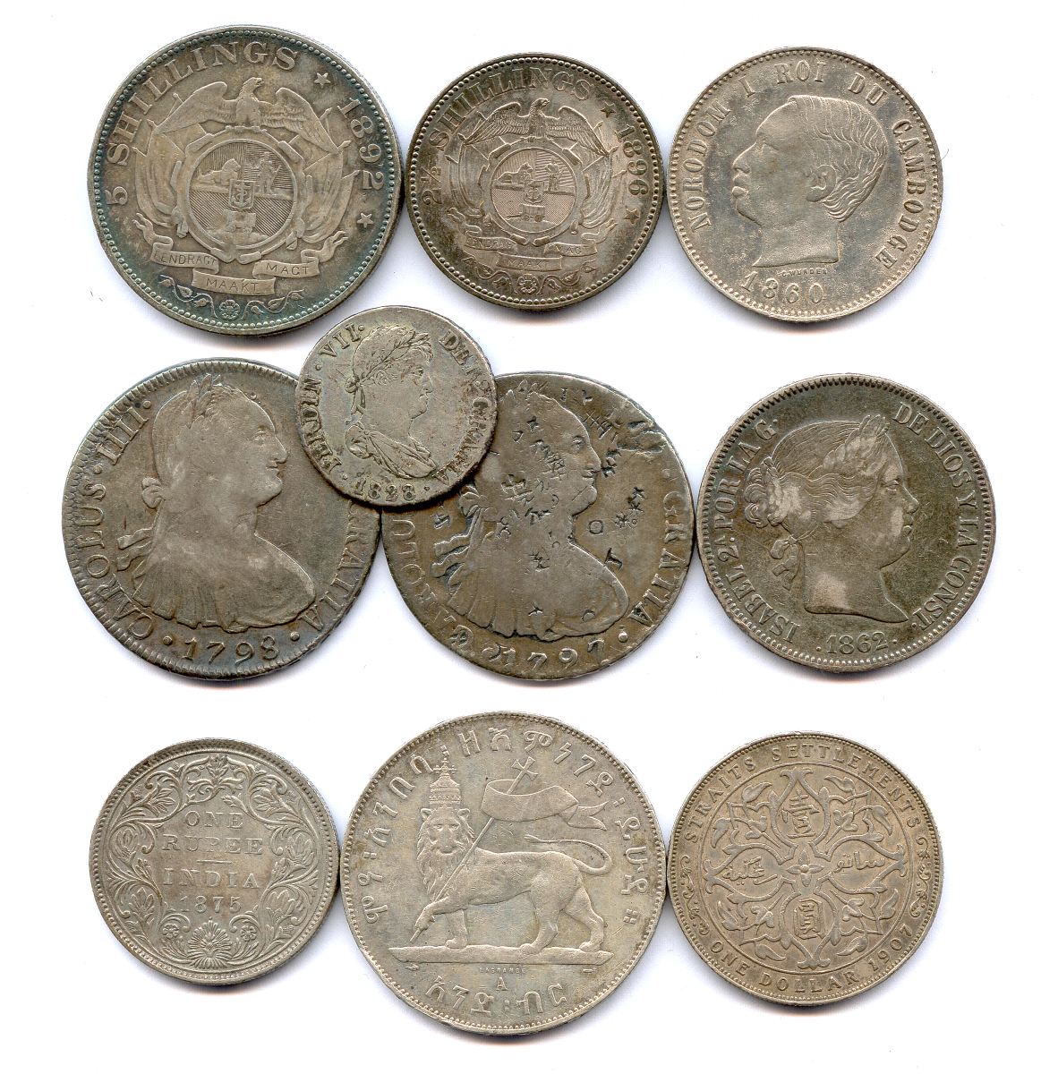 8 reales Charles IV 1797 avec de nombreuses contremarques chinoises, 20 reales Isabelle II dEspagne 1862, Birr (Talari) Ménélik II Ethiopie, one rupee Inde Victoria 1875, one dollar Malaisie Edouard VII 1907.