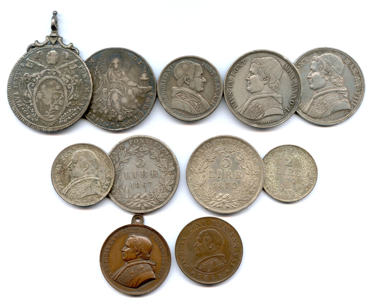 On joint une médaille en cuivre de Pie IX et une pièce 2 soldi (10 cent.) 1866 Rome.
