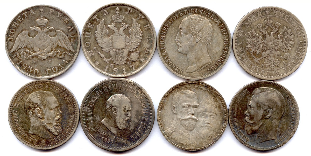 Lot de huit monnaies dargent Russie: Rouble Alexandre Ier 1817, Rouble Nicolas Ier 1830, Rouble Alexandre II 1859 (monument de Nicolas Ier), Rouble Alexandre II 1877, Rouble Alexandre III 1883, Rouble Alexandre III 1892, Rouble Nicolas II 1896, Rouble des Romanof 1913. Beaux. T.B. et Très beau.