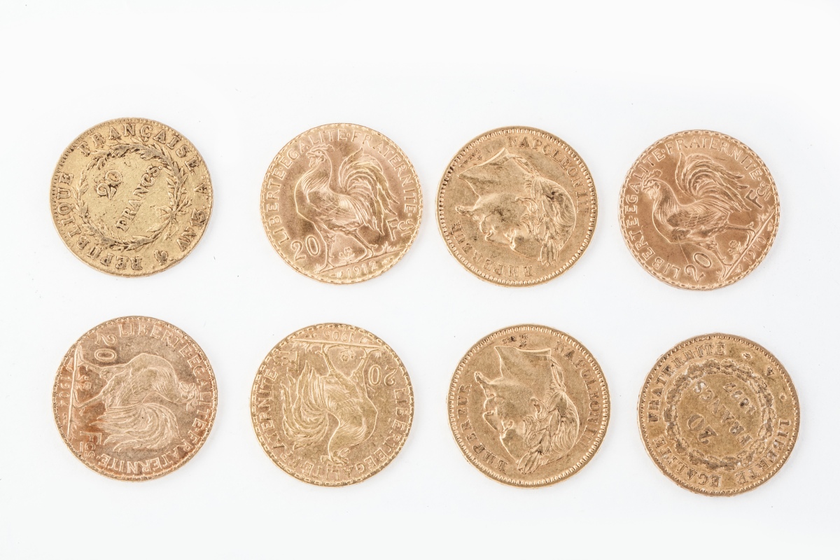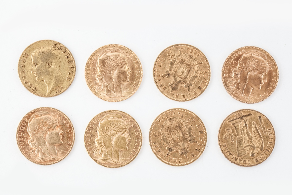 France. Napoléon Ier, Napoléon III, IIIe République. 8 pièces de 20F or: Napoléon Empereur, tête nue (Paris, an XIII), Napoléon III lauréé (Paris, 1862, 1865), Génie (Paris 1877), Coq (1903, 1904, 1910, 1912).