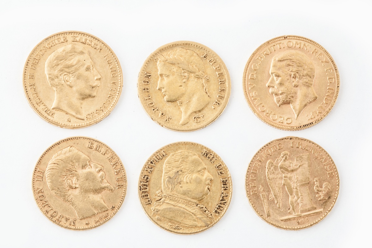 4 pièces de 20 francs or. Napoléon Empereur lauréé (Paris, 1811), Louis XVIII (Paris, 1814), Napoléon III Empereur tête nue (Strasbourg, 1855), Génie (Paris, 1890).