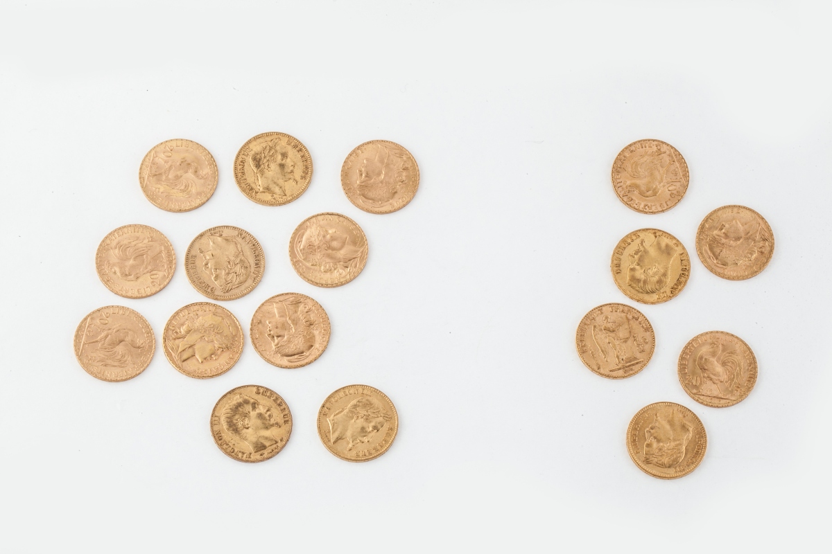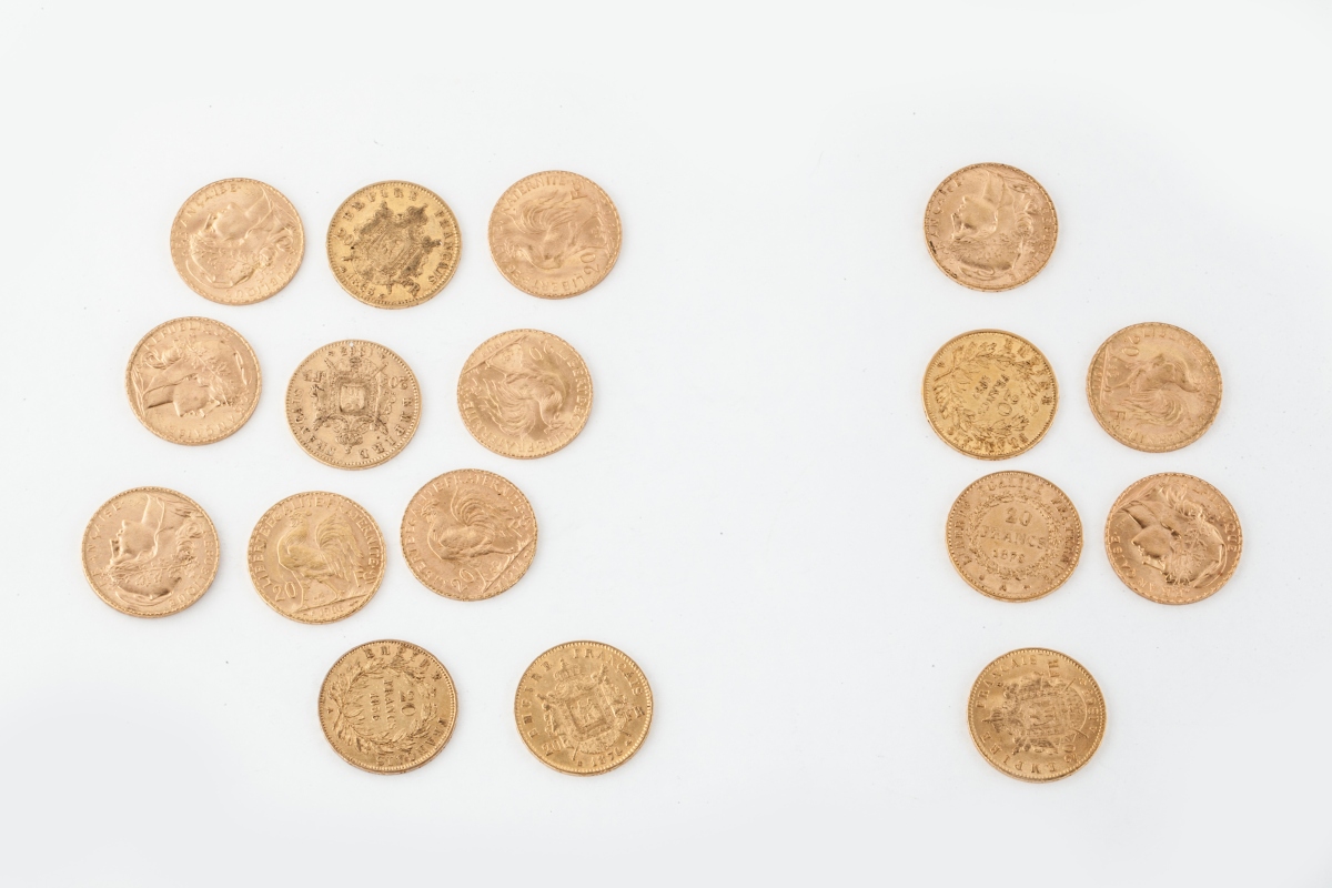 France. Napoléon III et IIIe République. 17 pièces de 20F or: Napoléon III tête nue (1856, 1857), Napoléon III tête laurée (1863 x 3, 1870), Génie (1876) et Coq (1904, 1906, 1909, 1910 x 4, 1912 et 1914).TTB SUP.