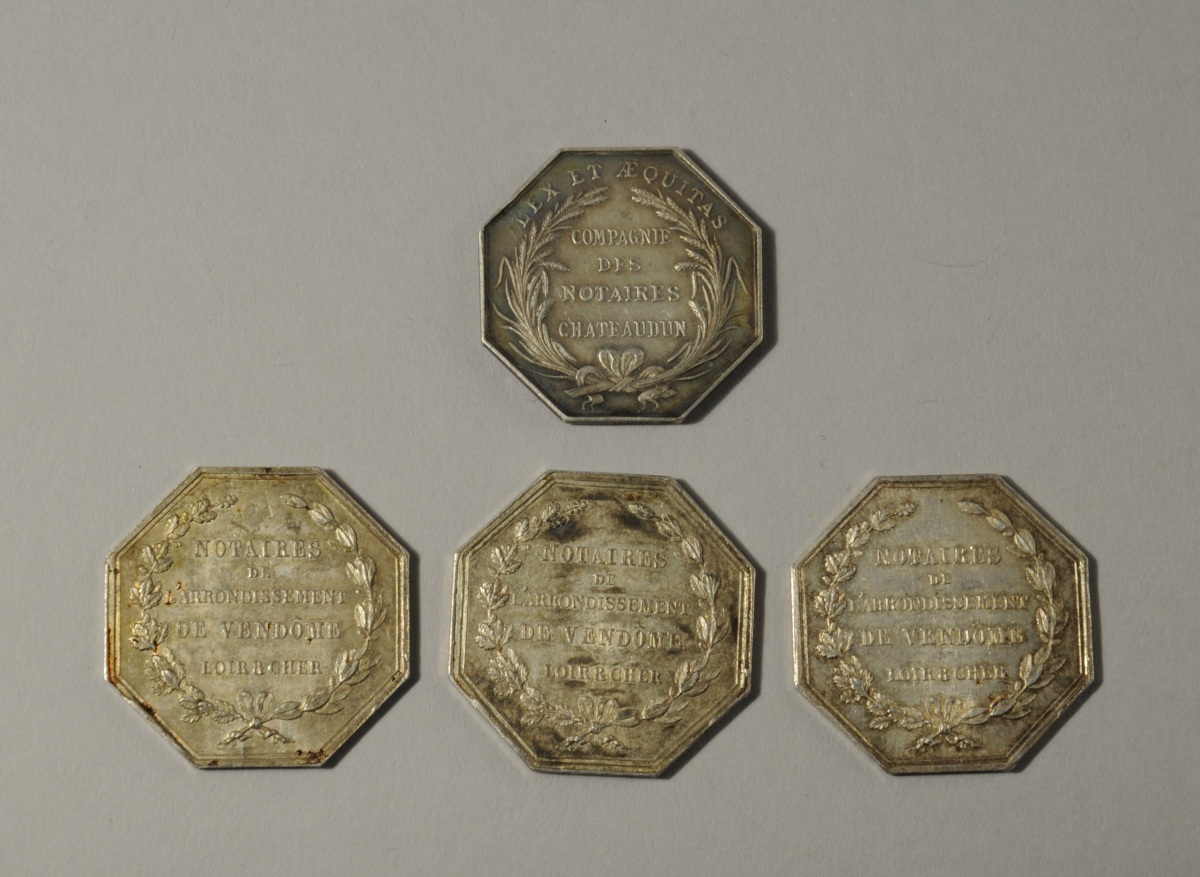 QUATRE JETONS DE NOTAIRE de forme octogonale en argent: