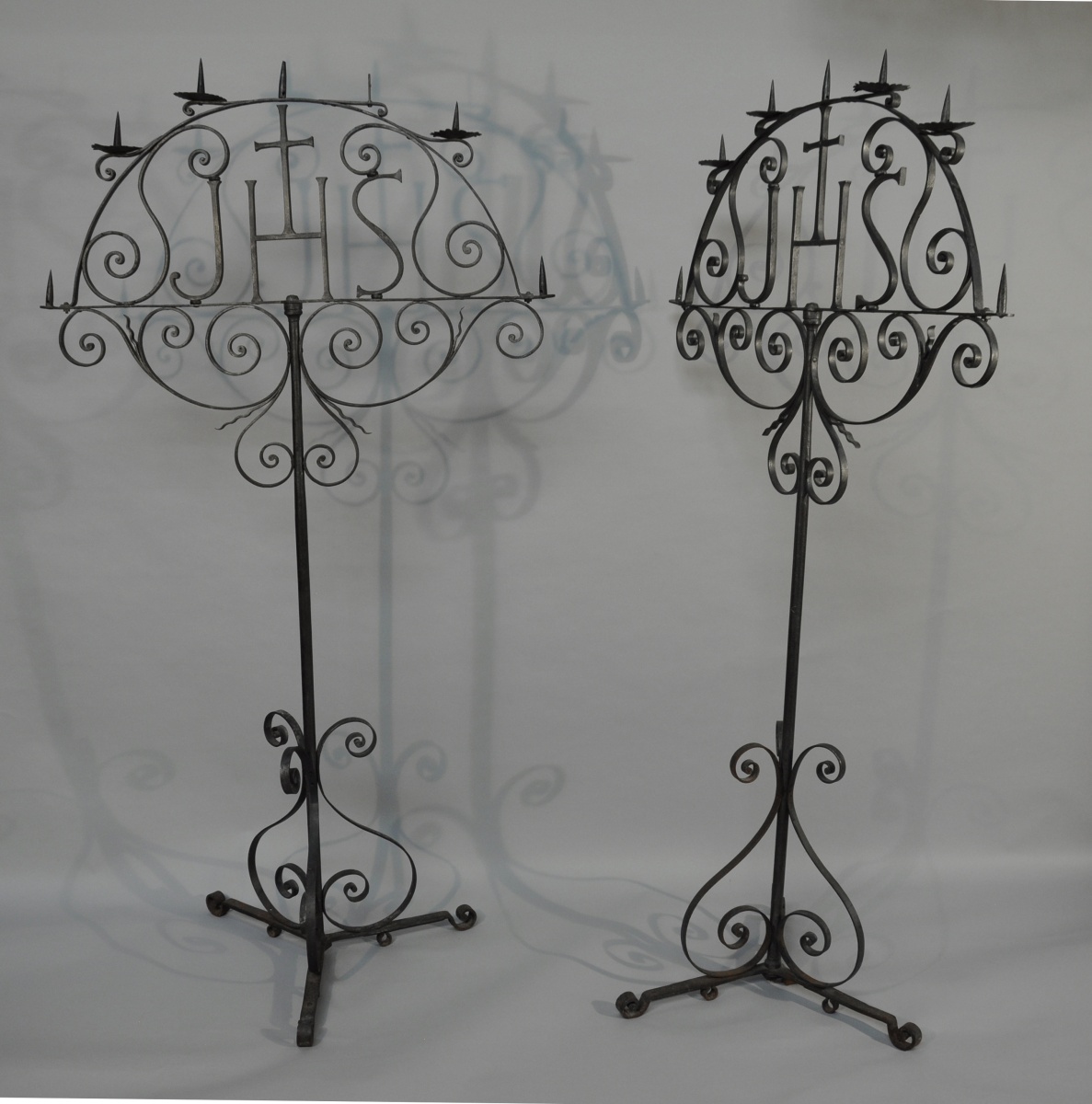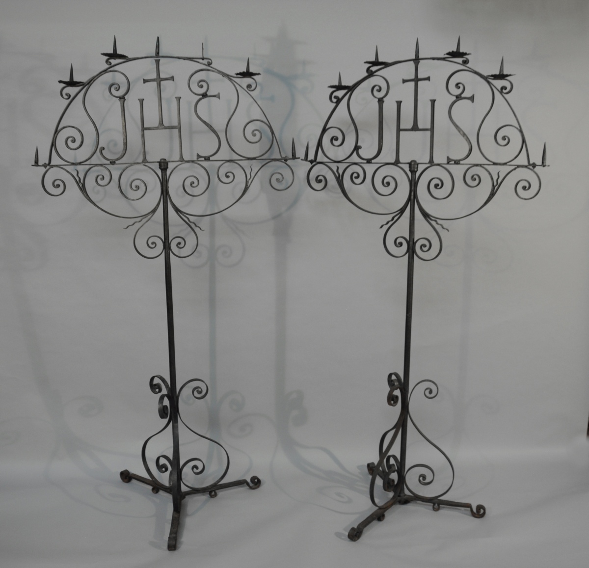 PAIRE DE PIQUE-CIERGES d'ÉGLISE en fer forgé à 7 feux. Marqués "JHS" et reposant sur un piètement tripode à volutes.