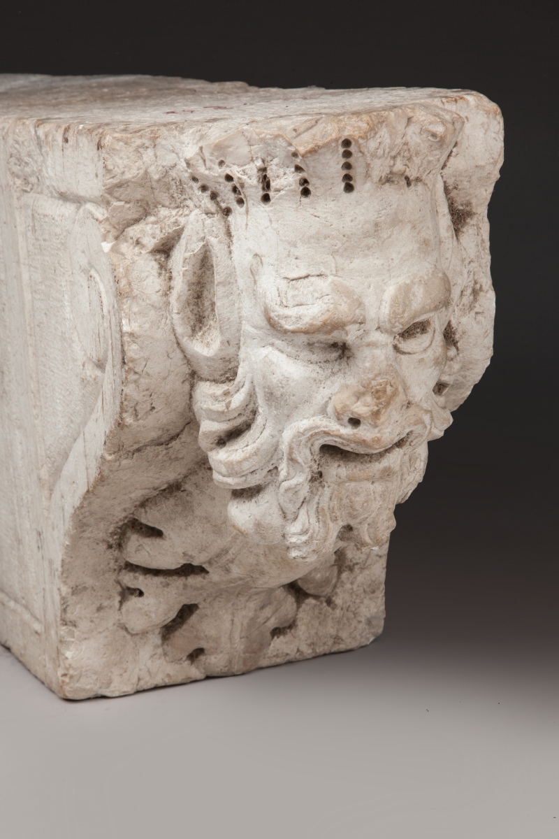 DEUX ÉLÉMENTS d'architecture en calcaire, consoles supportant le linteau d'une porte ou d'une fenêtre (?). une tête d'homme barbu à la moustache fleuri sort de manière saillante, alors que les deux côtés sont sculptés d'un rectangle et d'un motif en spirale.