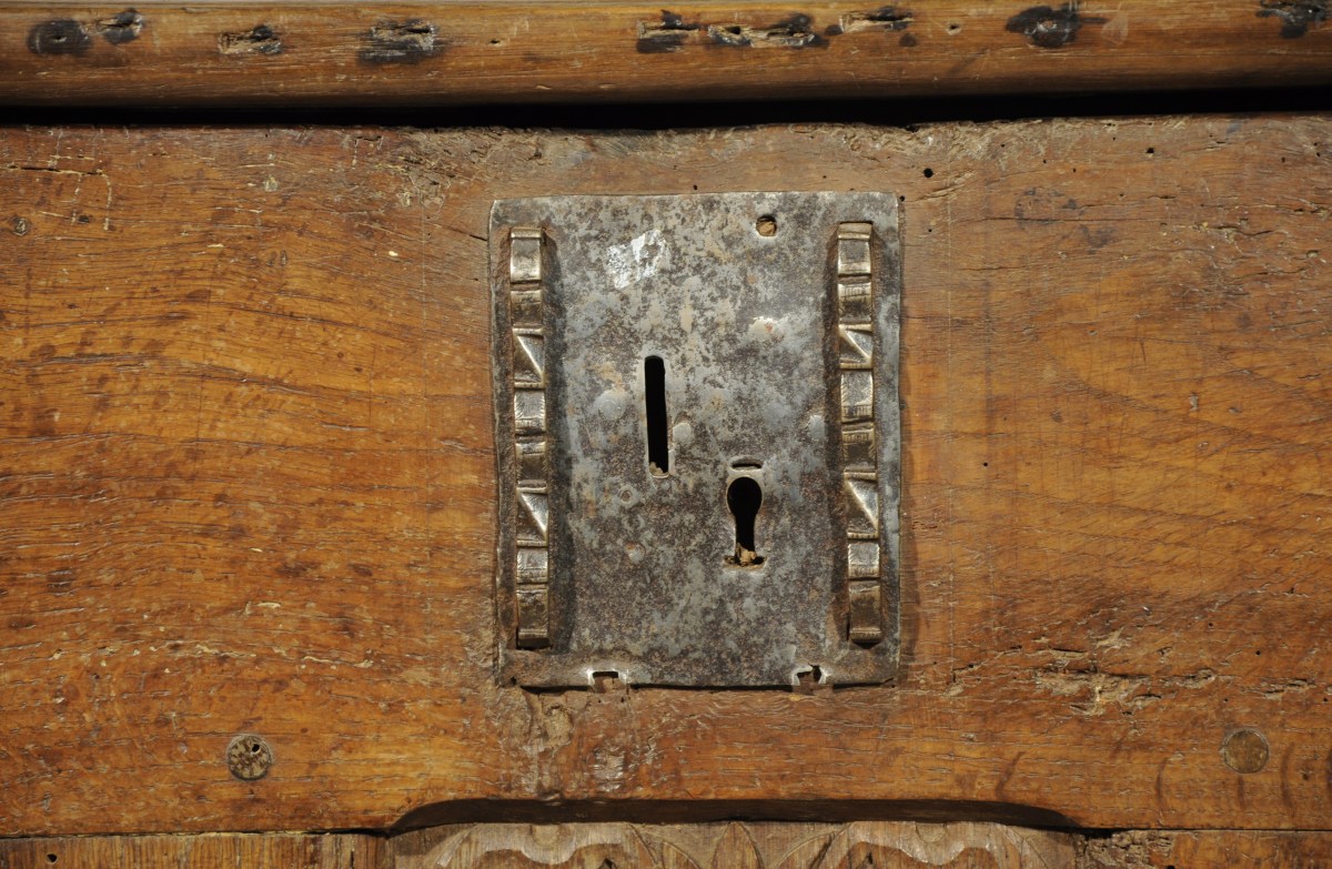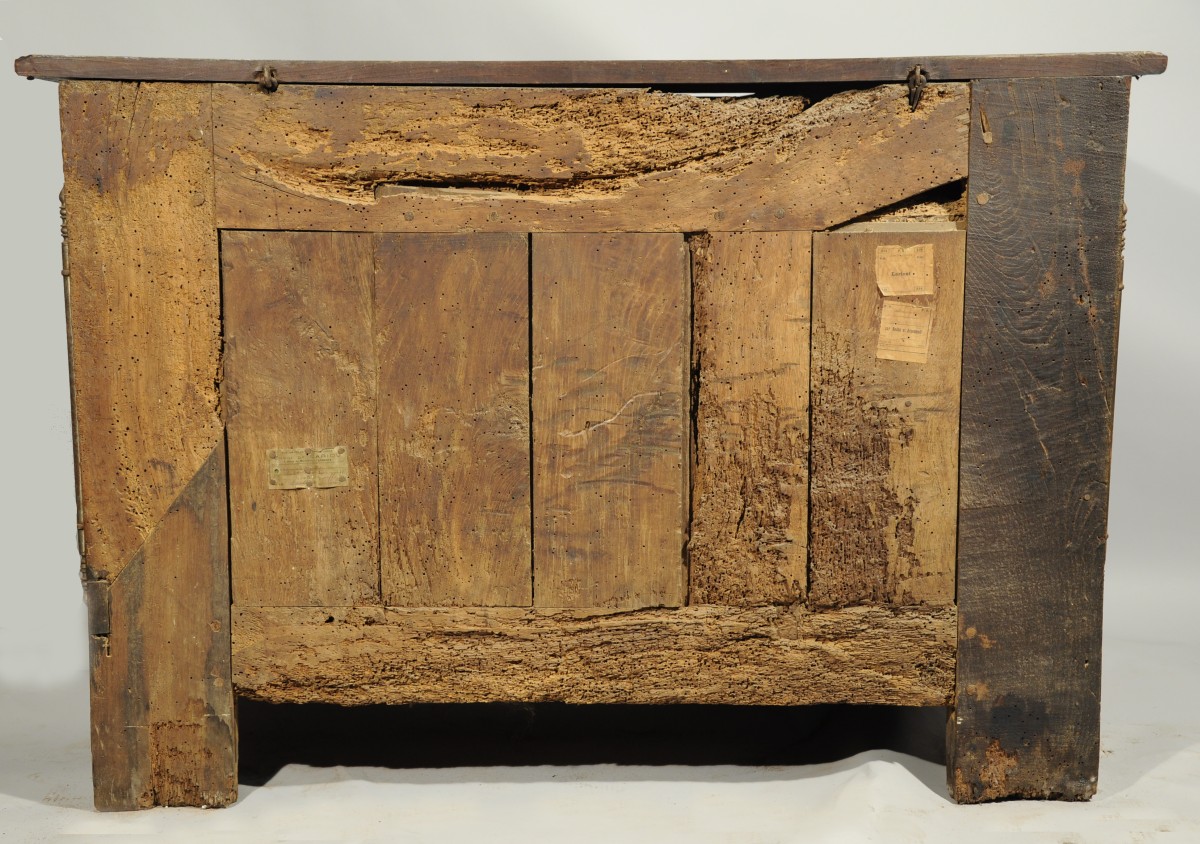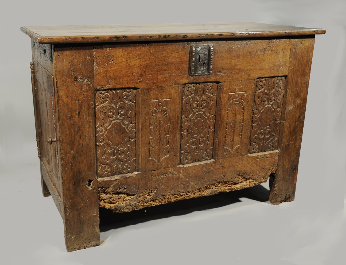 COFFRE en noyer sculpté en façade de feuilles d'acanthe stylisées et de palmettes. Ouvrant par une porte sur le côté.