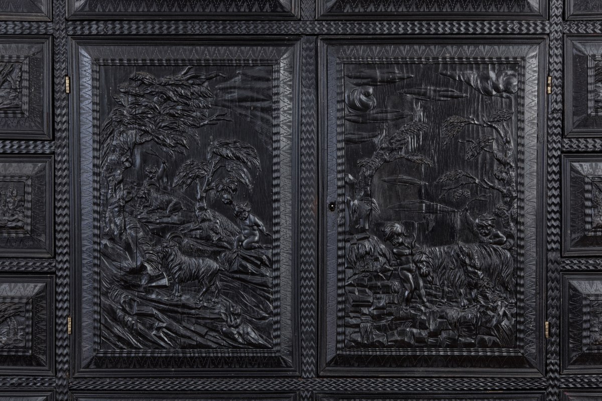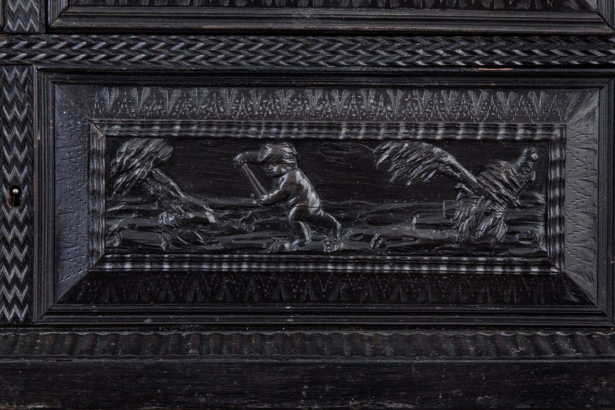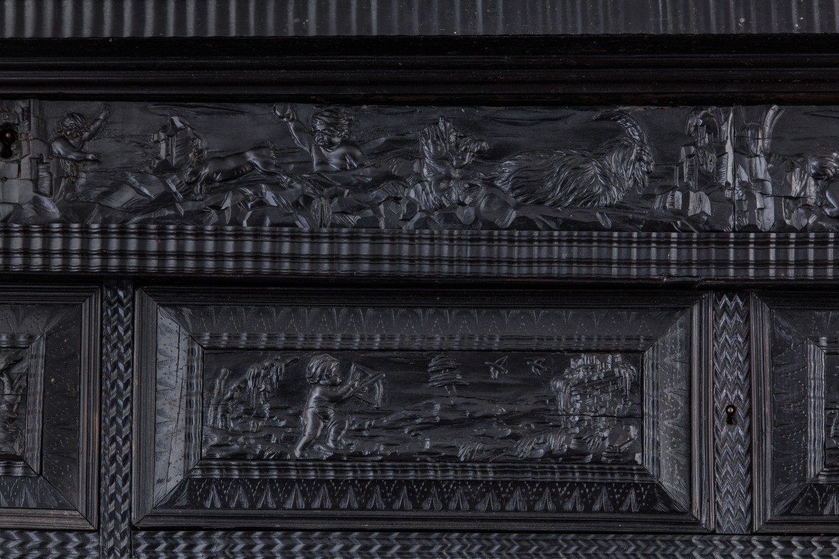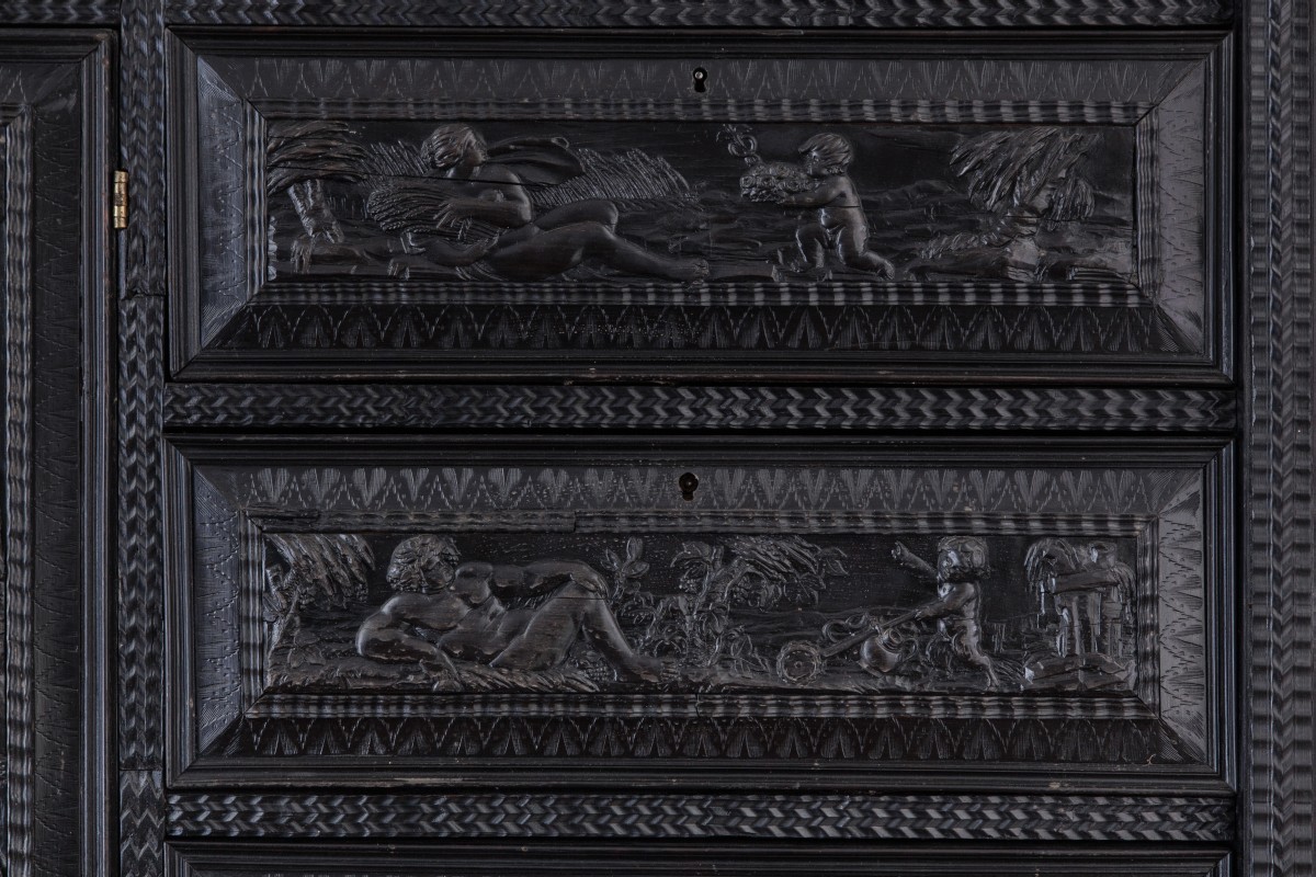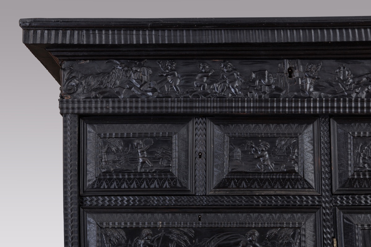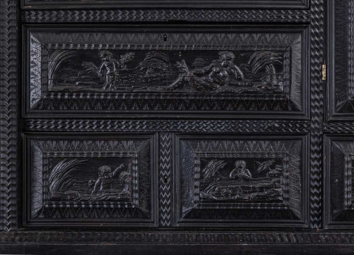 CABINET aux AMOURS de forme rectangulaire en placage d'ébène et de bois noirci sur âme de chêne et de résineux, richement sculpté en bas-relief et gravé de scènes animées d'amours et de putti. Il présente en façade deux vantaux encadrés de 12 tiroirs sur cinq étages et deux tiroirs dans la corniche, dans un entourage de moulures ondées. Les vantaux s'ouvrent sur un théâtre. Les côtés sont gravés de motifs floraux et animaliers.