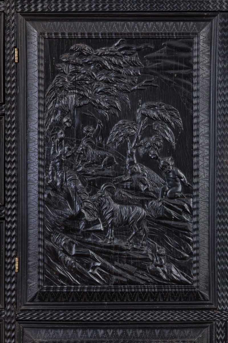 Les deux vantaux sont sculptés d'enfant gardant des chèvres, d'après une uvre de François DUQUESNOY. Le revers des vantaux à décor en marqueterie de bois précieux et d'ivoire d'une rose des vents dans un encadrement géométrisant.