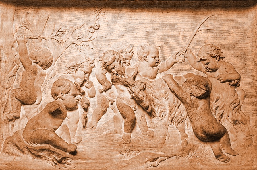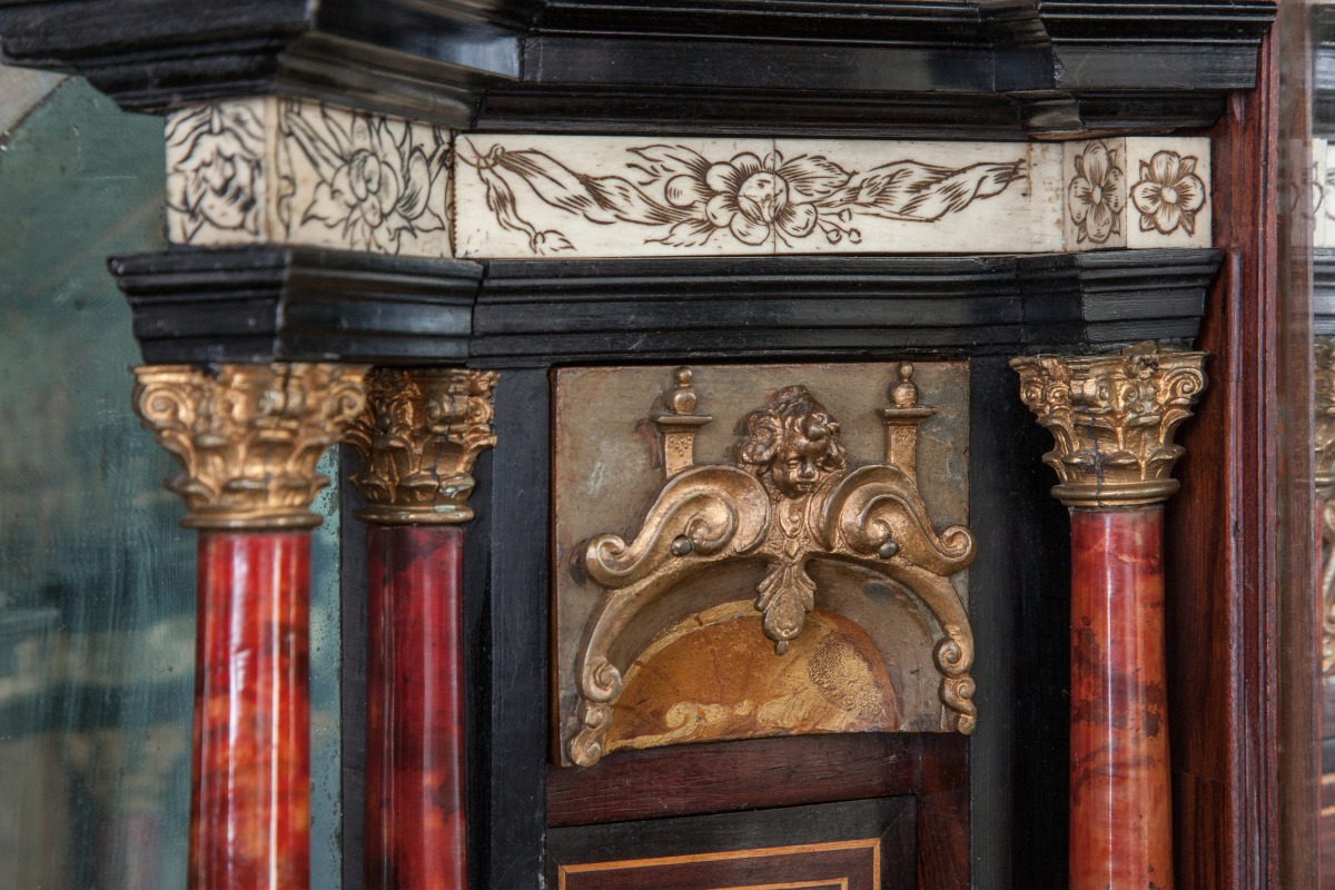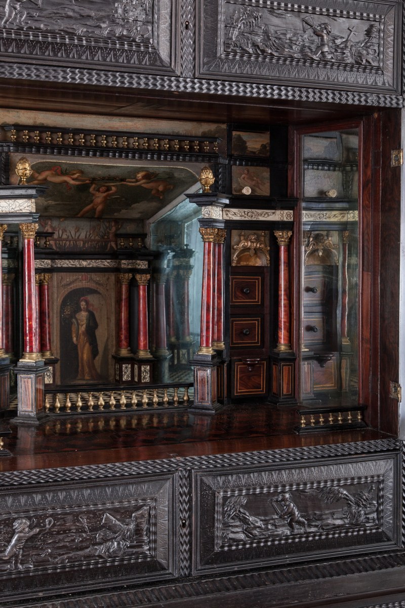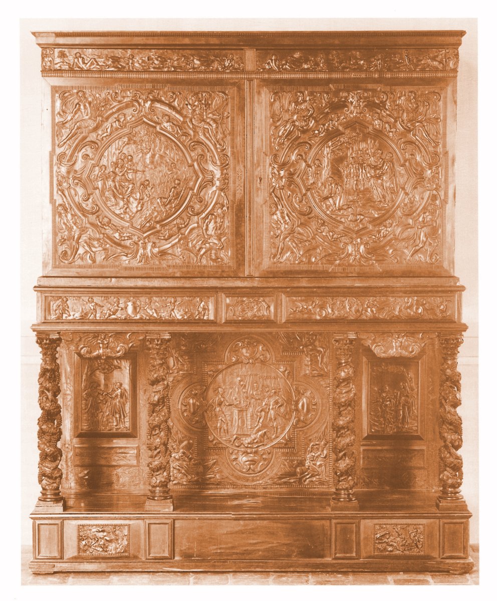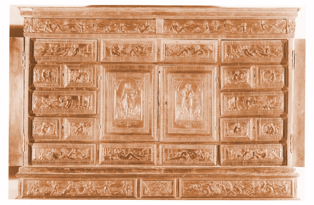 Les six tiroirs flanquant les vantaux présentent des amours et des putti au service de nymphes et des Dieux de l'Olympe: Vénus, Neptune, Cérès et Bacchus. Les six tiroirs des rangées du haut et du bas présentent deux registres dans lesquels s'amusent des enfants avec des instruments de musique, chassant à l'arbalète, faisant tourner un moulin à vent, domptant une chèvre, se baignant, tirant à la fronde ou encore effrayant un animal avec un masque. Les deux tiroirs de la corniche sont ornés d'une frise d'enfants jouant et gardant des chèvres.