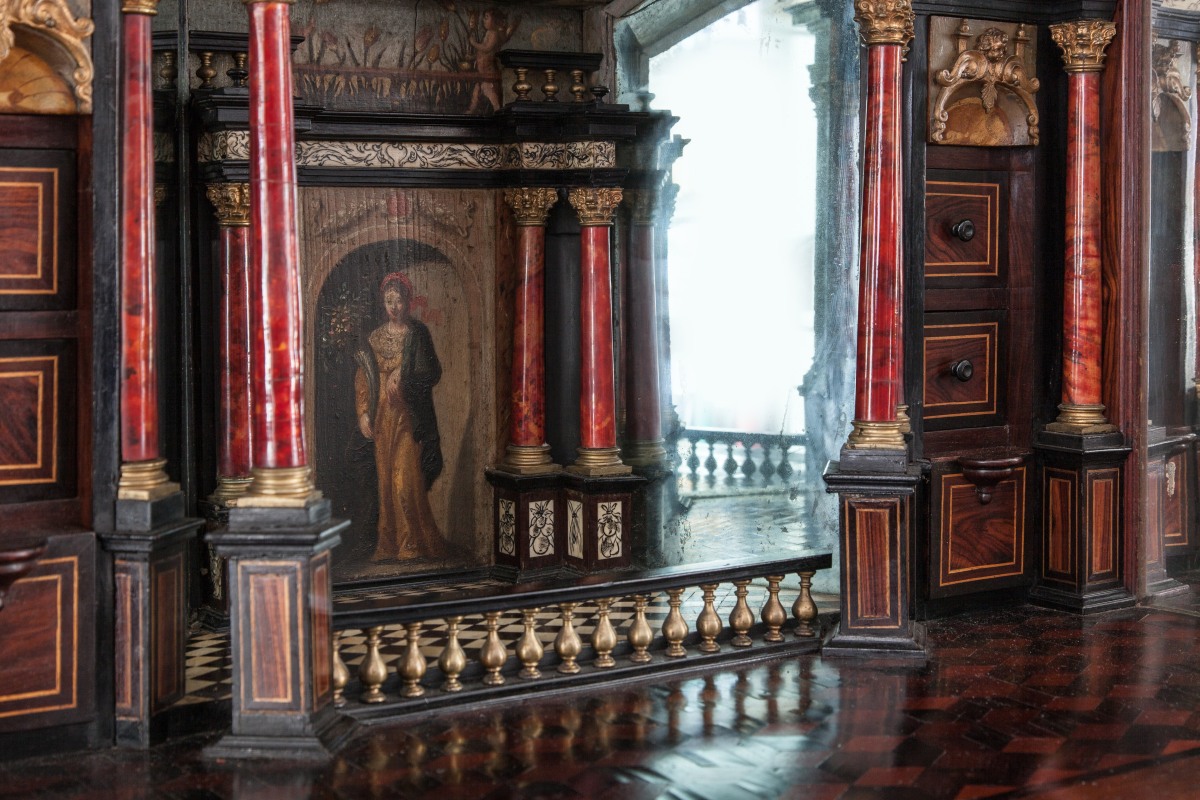 Le théâtre intègre 13 tiroirs, tantôt peints, tantôt marquetés de bois précieux, dans une architecture ornée d'ivoire gravé et de balustrades. 10 colonnes (dont deux en demi) plaquées d'écaille rouge, les chapiteaux et bases en bronze doré, se reflètent dans un jeu de miroirs. La partie centrale du caisson, marquetée d'un damier et de cubes, simule une perspective de palais accentuée par deux miroirs. Elle est agrémentée de trois panneaux peints. Celui du fond figurant l'allégorie de l'Abondance est sommée de deux Amours portant des tulipes. Le plafond de forme trapézoïdale reçoit trois putti élevant une couronne de fleurs.