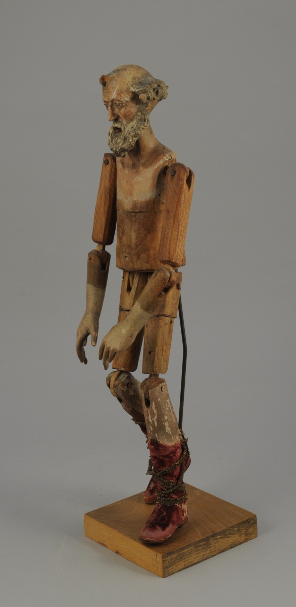 SANTON de CRÈCHE NAPOLITAINE articulé figurant un vieil homme barbu en bois sculpté et peint. Bottes en velours cramoisi et galons or (usures).