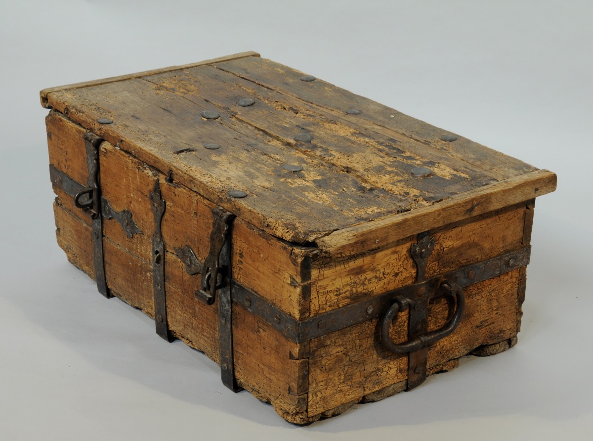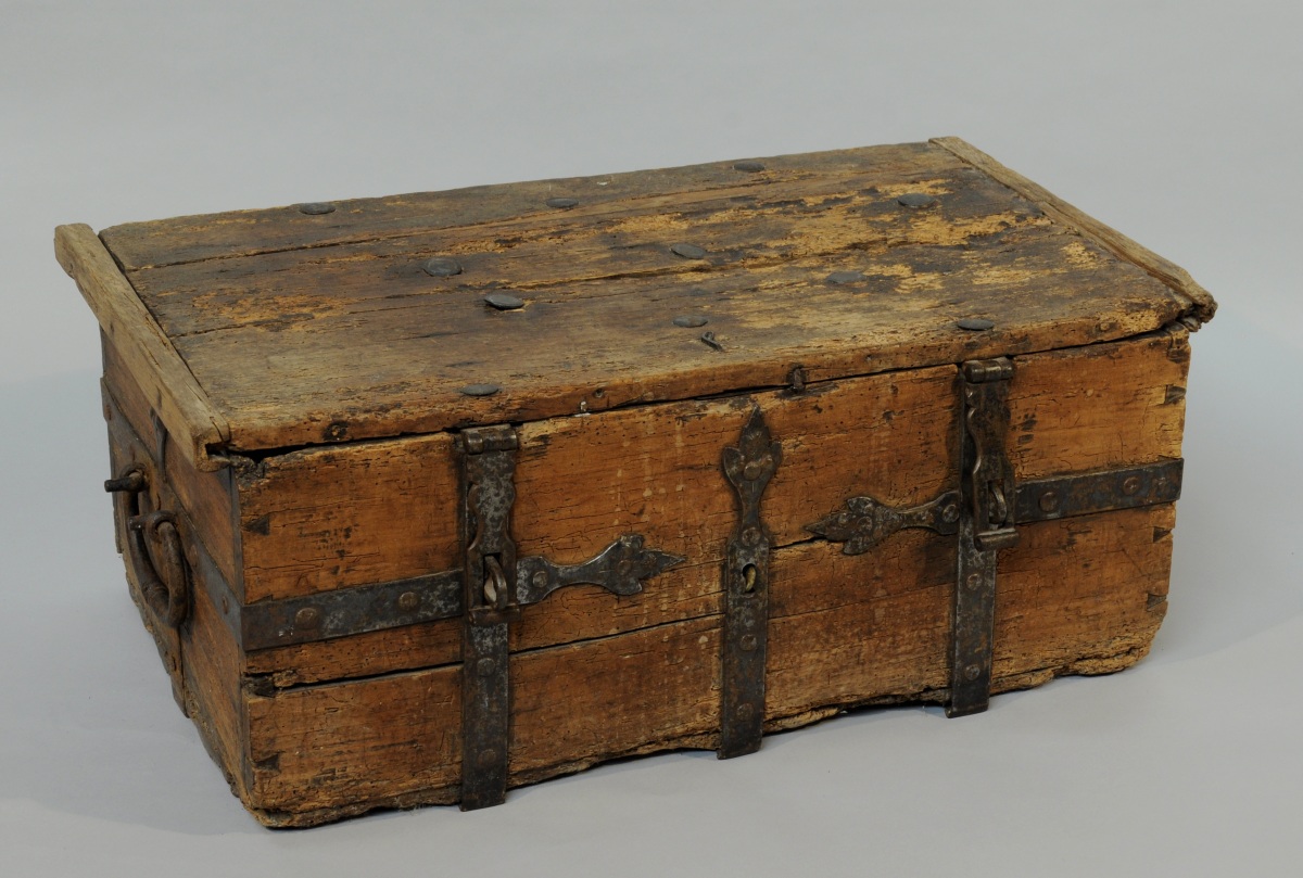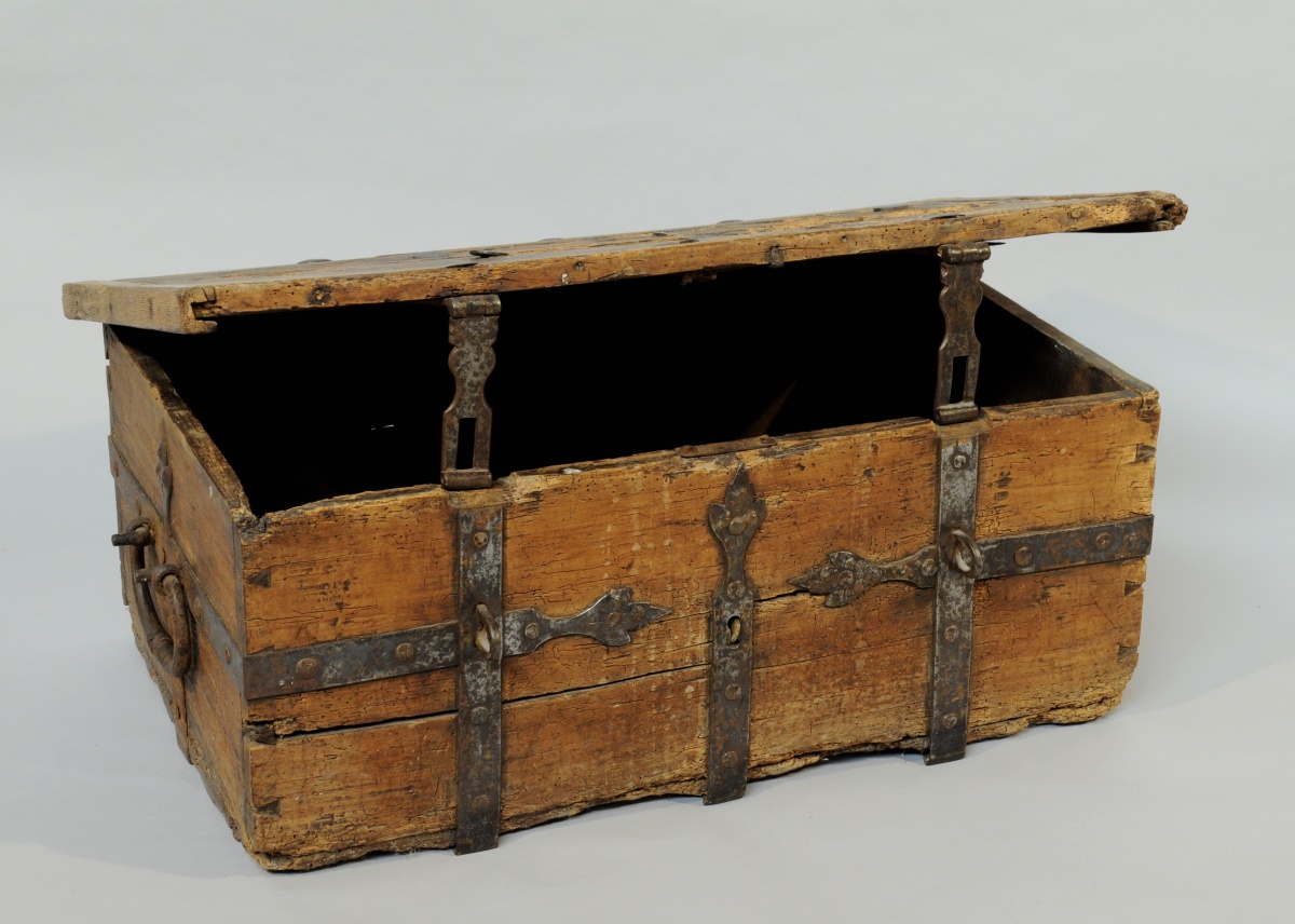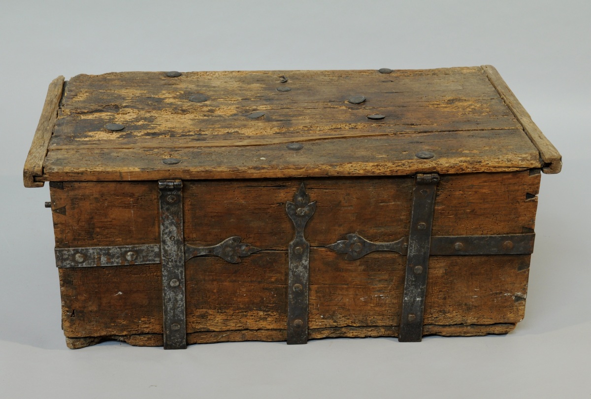 COFFRE de forme rectangulaire en bois naturel. Ferrures et pentures ouvragées fleur-de-lisées. Poignées latérales.
