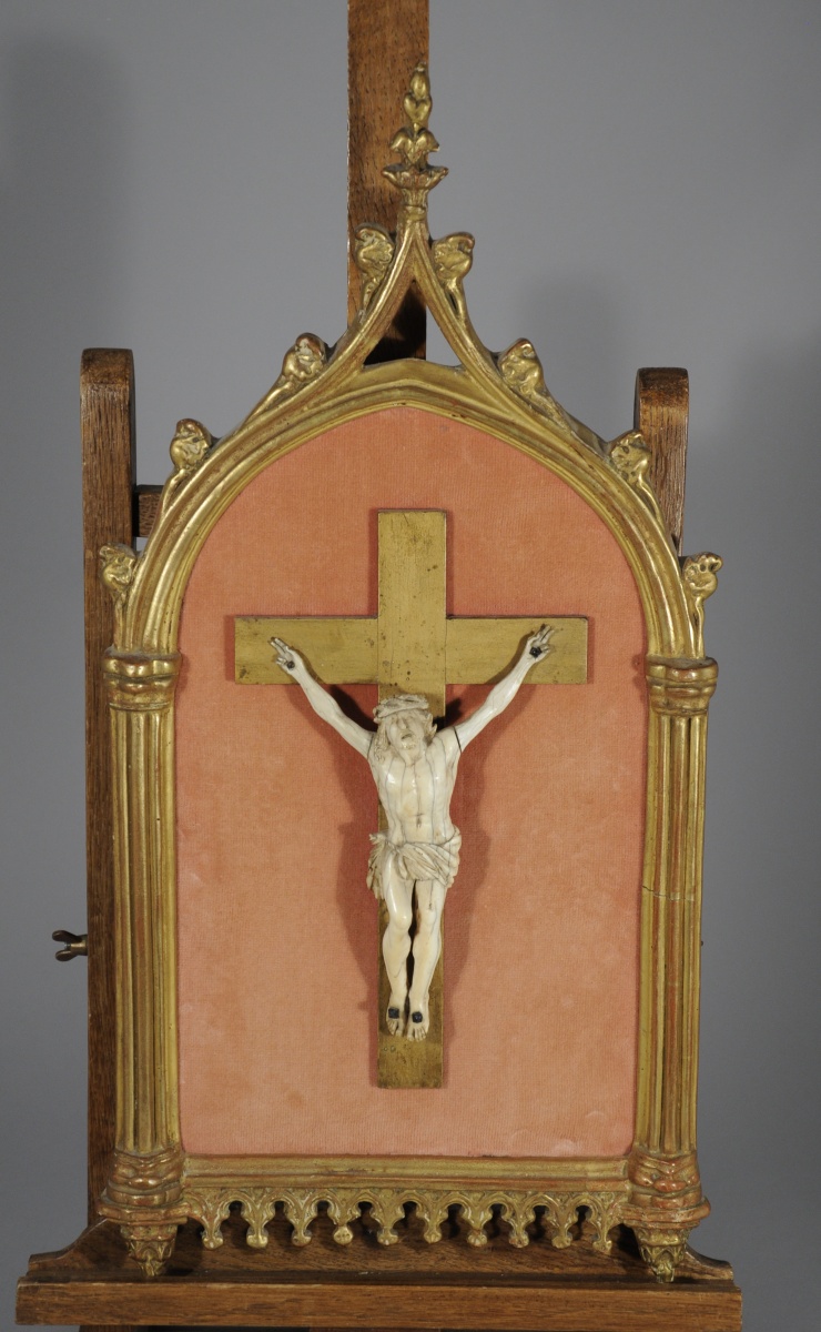 CRUCIFIX. Le Christ en ivoire sur Croix sculpté. Croix en bois doré. Cadre en bois mouluré, sculpté et doré, à décor de feuillage et colonnes cannelées.