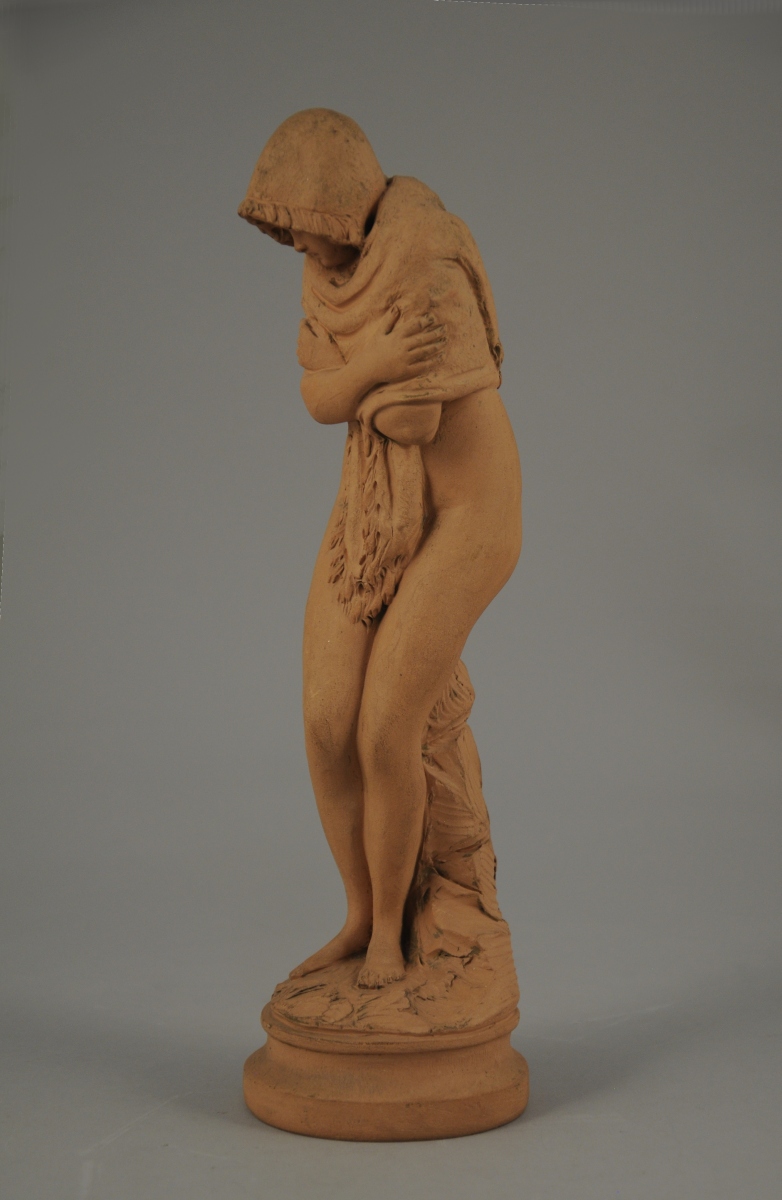 Célèbre sculpture en marbre réalisée en 1783 par Jean Antoine Houdon (1741-1828) baptisée aussi l'Hiver, et refusée au Salon de 1783 pour obscénité. Conservée au Musée de Montpellier, le Metropolitan Museum de New York en conserve un exemplaire en bronze sans la cruche cassée, dont s'inspire notre terre cuite.