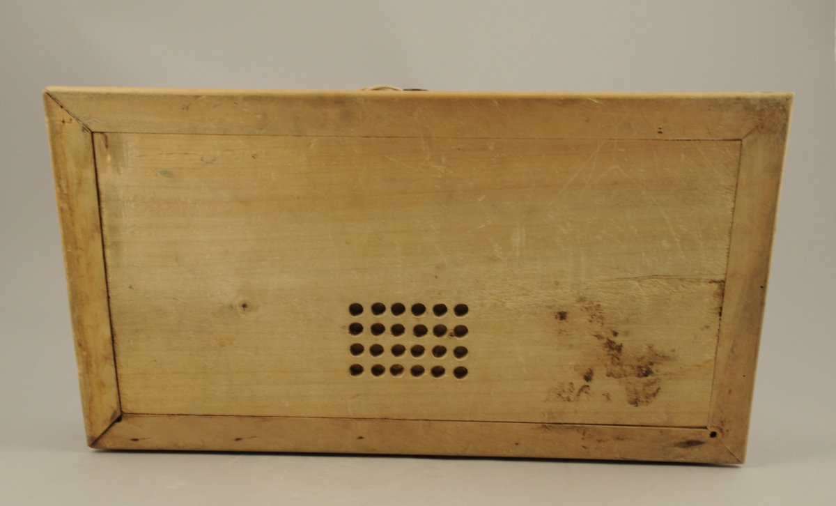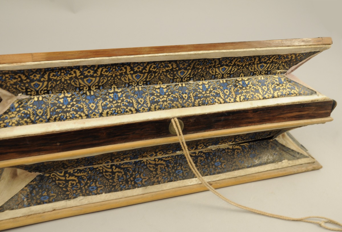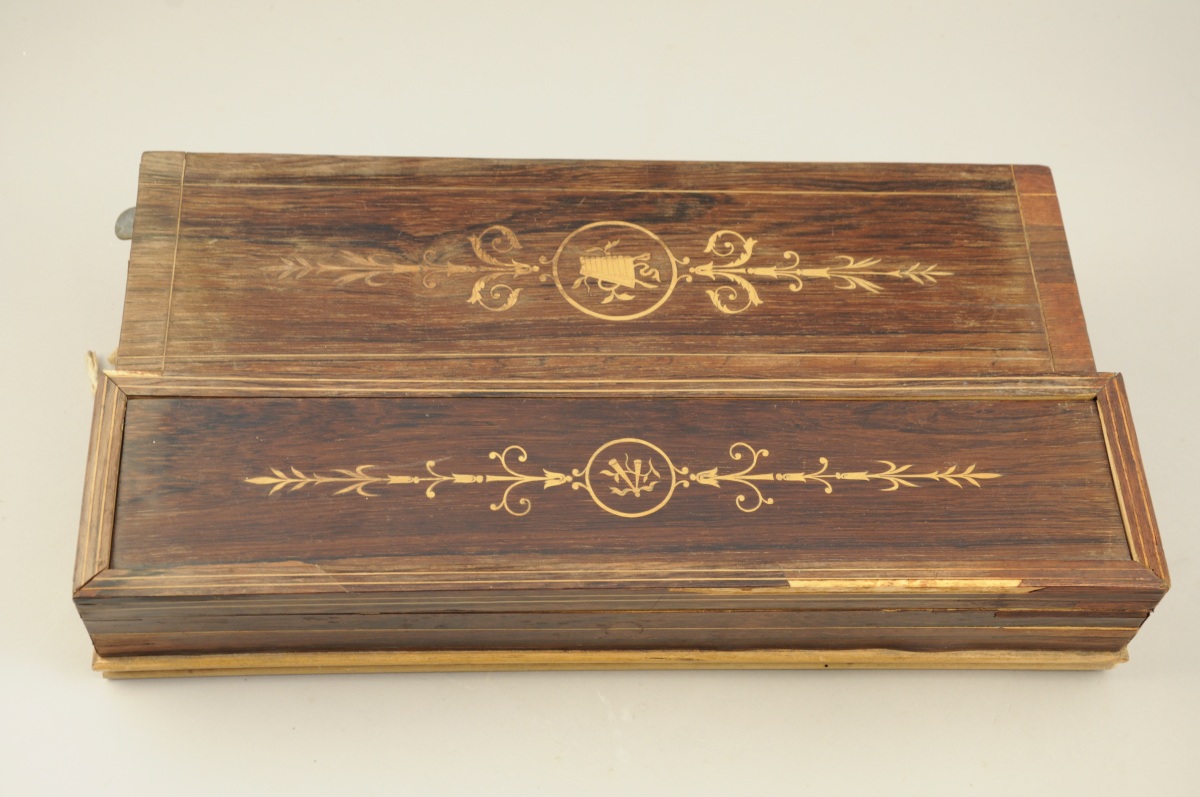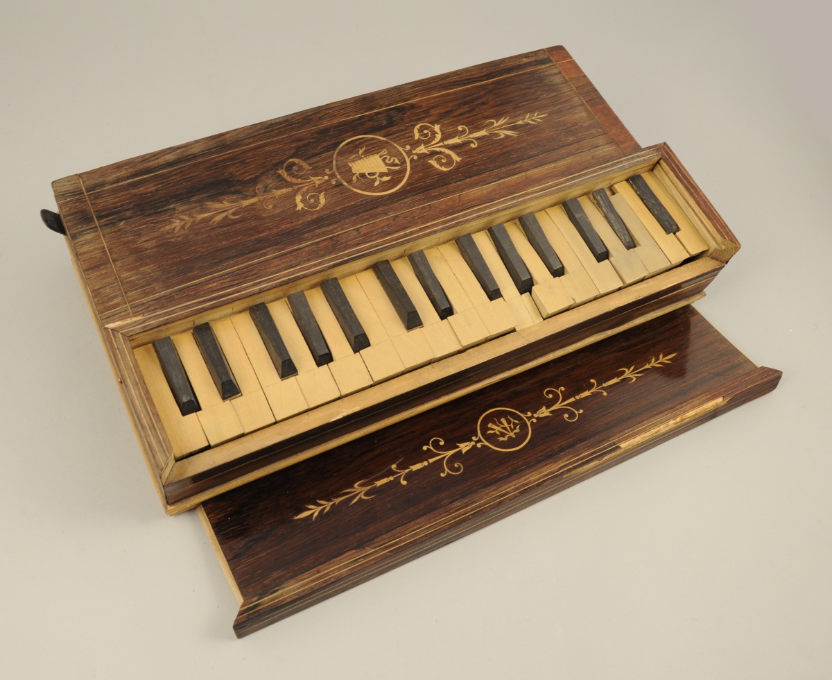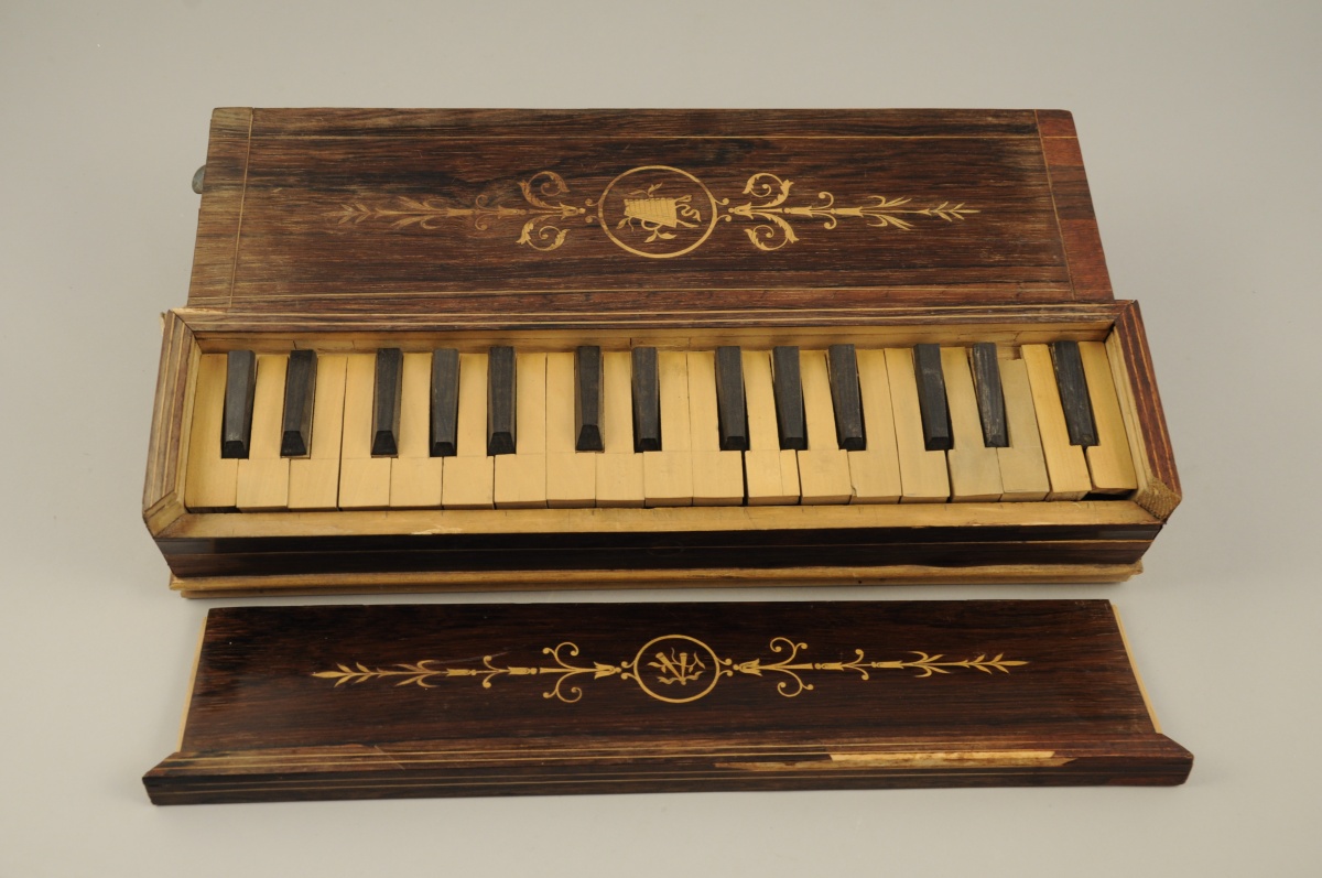 HARMONIUM portatif dit de SALON. Instrument à double soufflet. Boîte en placage de palissandre et marqueterie de bois clair.