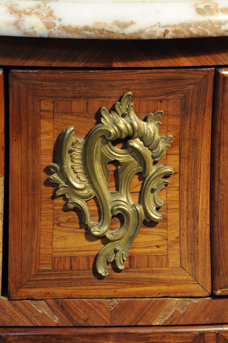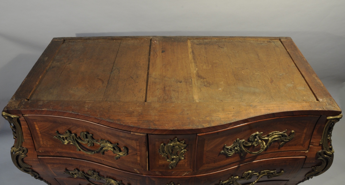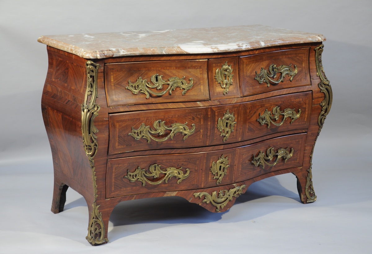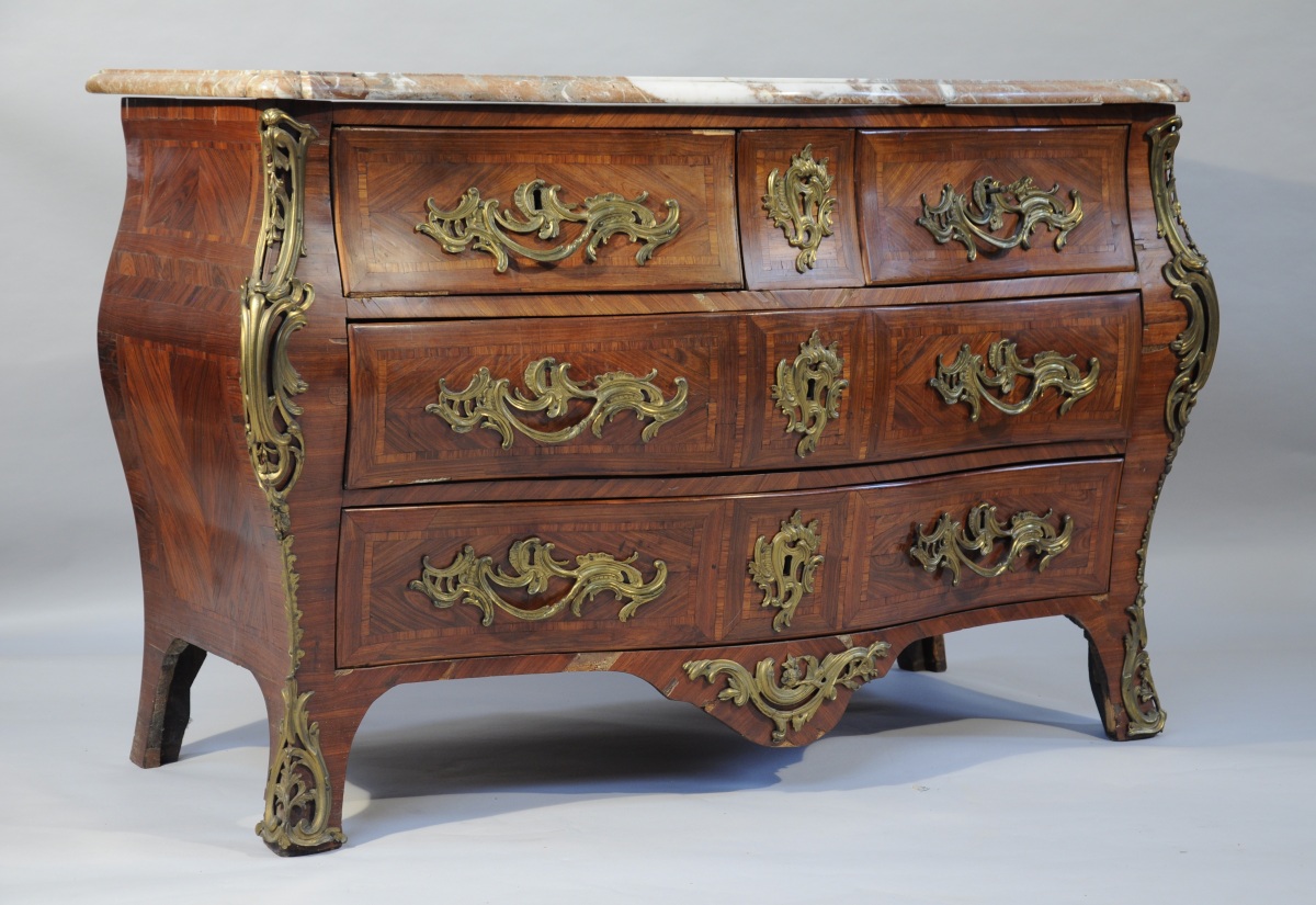 COMMODE TOMBEAU en placage de bois de rose disposé en feuilles ouvrant en façade par cinq tiroirs sur trois rangs, dont un en faux dormant. Montants antérieurs pincés terminés par des pieds courbés. Montants et pieds postérieurs courbés. Ornementation de bronzes ciselés et dorés ajourés tels que poignées de tirage, entrées de serrure, chutes, sabots et tablier. Dessus de marbre rouge de Belgique.