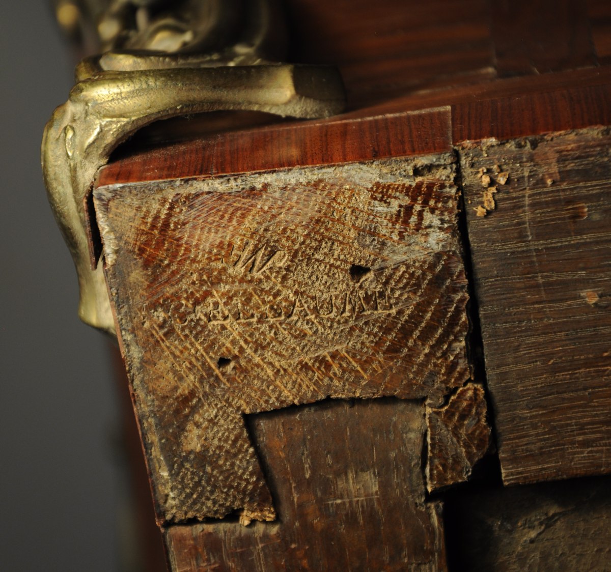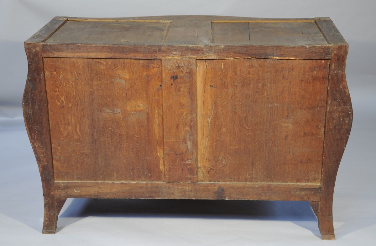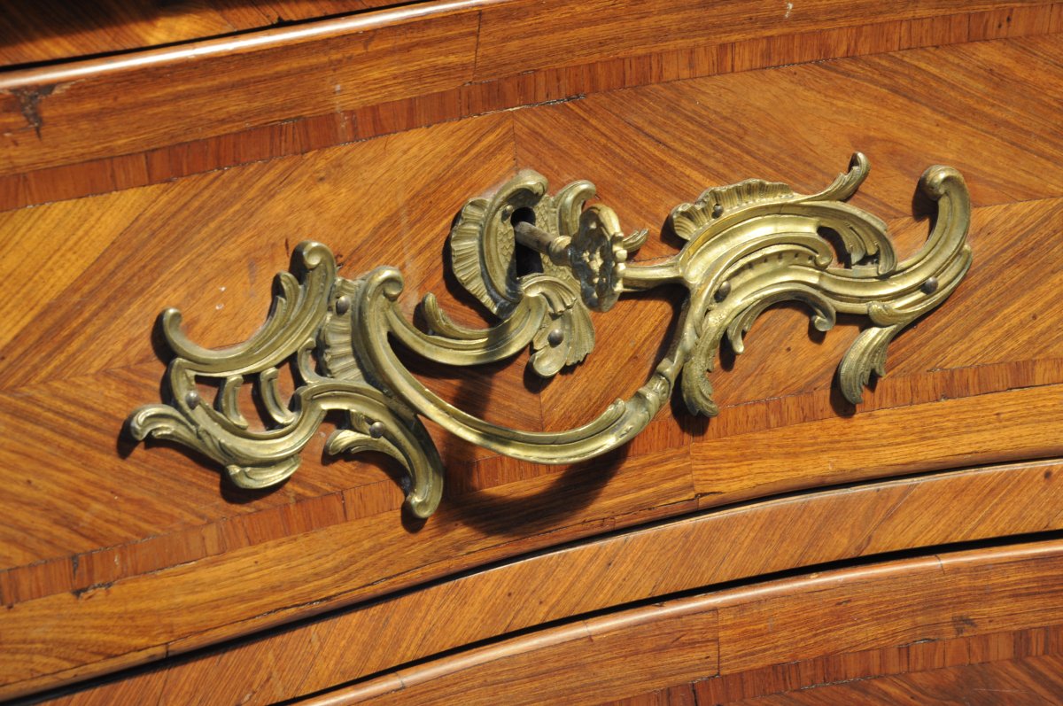 COMMODE TOMBEAU en placage de bois de rose disposé en feuilles ouvrant en façade par cinq tiroirs sur trois rangs, dont un en faux dormant. Montants antérieurs pincés terminés par des pieds courbés. Montants et pieds postérieurs courbés. Ornementation de bronzes ciselés et dorés ajourés tels que poignées de tirage, entrées de serrure, chutes, sabots et tablier. Dessus de marbre rouge de Belgique.
