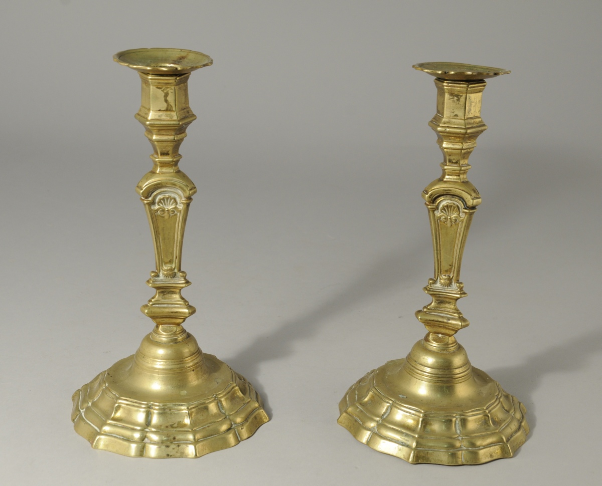 PAIRE de FLAMBEAUX en bronze. Pied circulaire, à contours moulurés, présentant une doucine à plusieurs ressauts. Ombilic uni, ceinturé de fines bandes. Collet inférieur en chapiteau, supportant un fût mouluré à trois pans, ornés de cartouches avec des coquilles en parties inférieures et supérieures. Binet et bobèches circulaires, à contours.